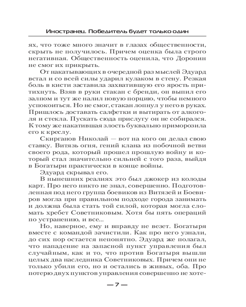 💳 Оплатить за товар можно при получении 🇰🇿 Есть бесплатная доставка по Казахстану от 1 дня 🎁 Копите бонусы с каждой покупки Серия: Современный фантастический боевик Боевые действия против клана Дорониных серьезно ударили по клану Советниковых. Арсений успешно лавировал и смог неплохо поднять свой авторитет, но неожиданное появление матери, похищение Ао и Машки, вносит свои коррективы... К тому же он начинает подозревать, что бояться нужно не только явных врагов, но и кого-то из друзей... Тучи сгущаются... Победитель будет только один... |
