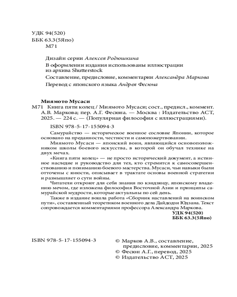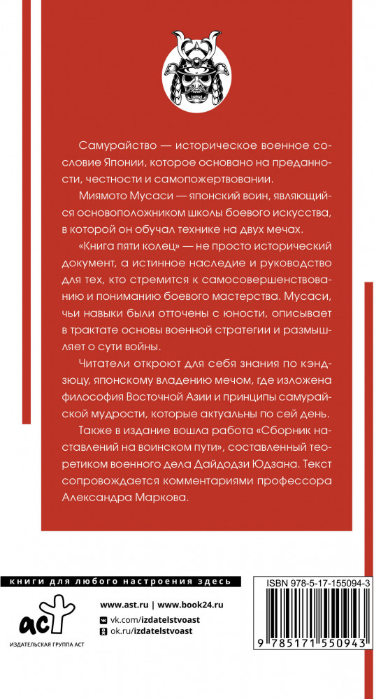 💳 Оплатить за товар можно при получении 🇰🇿 Есть бесплатная доставка по Казахстану от 1 дня 🎁 Копите бонусы с каждой покупки Серия: Популярная философия с иллюстрациями Самурайство — историческое военное сословие Японии, которое основано на преданности, честности и самопожертвовании. Миямото Мусаси — японский воин, являющийся основоположником школы боевого искусства, в которой он обучал технике на двух мечах. «Книга пяти колец» — не просто исторический документ, а истинное наследие и руководство для тех, кто стремится к самосовершенствованию и пониманию боевого мастерства. Мусаси, чьи навыки были отточены с юности, описывает в трактате основы военной стратегии и размышления о сути войны. |