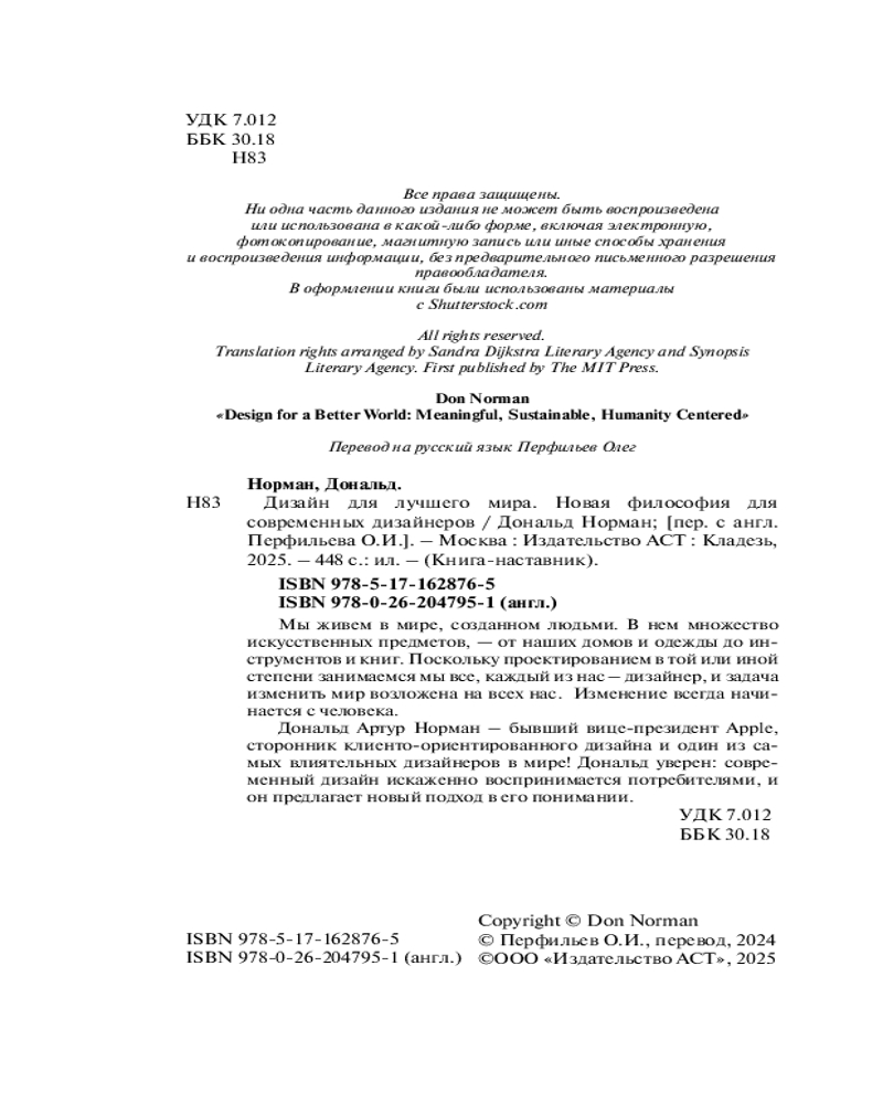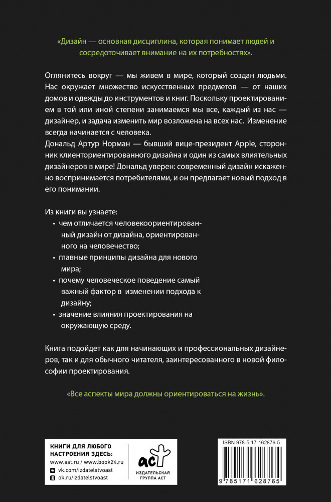 💳 Оплатить за товар можно при получении 🇰🇿 Есть бесплатная доставка по Казахстану от 1 дня 🎁 Копите бонусы с каждой покупки Серия: Книга-наставник Мы живем в мире, созданном людьми. В нем множество искусственных предметов, — от наших домов и одежды до инструментов и книг. Поскольку проектированием в той или иной степени занимаемся мы все, каждый из нас — дизайнер, и задача изменить мир возложена на всех нас. Изменение всегда начинается с человека. Дональд Артур Норман — бывший вице-президент Apple, сторонник клиенто-ориентированного дизайна и один из самых влиятельных дизайнеров в мире! Дональд уверен: современный дизайн искаженно воспринимается потребителями, и он предлагает новый подход в его понимании. Книга подойдет как для начинающих и профессиональных дизайнеров, так и для обычного читателя, заинтересованного в новой философии проектирования. |