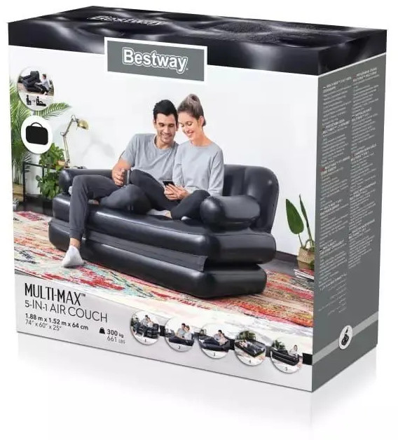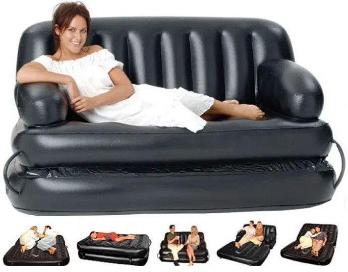 Надувной диван диван-трансформер Double 5-in-1 Multifunctional Couch, трансформируется в 5 положений для различных вариантов использования: диван, кровать с изголовьем, низкая кровать, высокая кровать, шезлонг. Диван изготовлен из высококачественного прочного винила, легко раскладывается, при хранении не занимает много места. Внутренняя конструкция с системой поддерживающих вертикальных стоек, водонепроницаемое верхнее покрытие. Диван имеет универсальный клапан для накачивания и сдувания — подойдет любой тип насоса: ручной, ножной, электрический (приобретается отдельно). В комплект входит специализированная самоклеющаяся заплатка для ремонта.