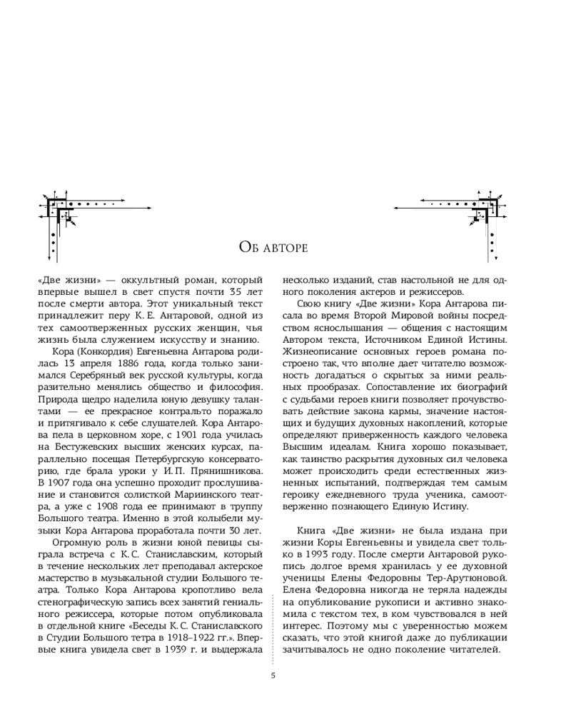 Серия: Мысли великих. Подарочное издание Книга «Две жизни» — мистический роман, который популярен у людей, интересующихся идеями Теософии и Учением Живой Этики. Этот текст был написан известной оперной певицей, ученицей К.С. Станиславского, солисткой Большого театра Конкордией Евгеньевной Антаровой (1886–1959). Как вспоминала сама Кора Антарова, книга писалась под диктовку во время Второй мировой войны и являлась знанием, переданным через общение с действительным Автором посредством яснослышания — способом, которым записали свои книги «Живой Этики» Е.И. Рерих и Н.К. Рерих, «Тайную доктрину» Е.П. Блаватская.