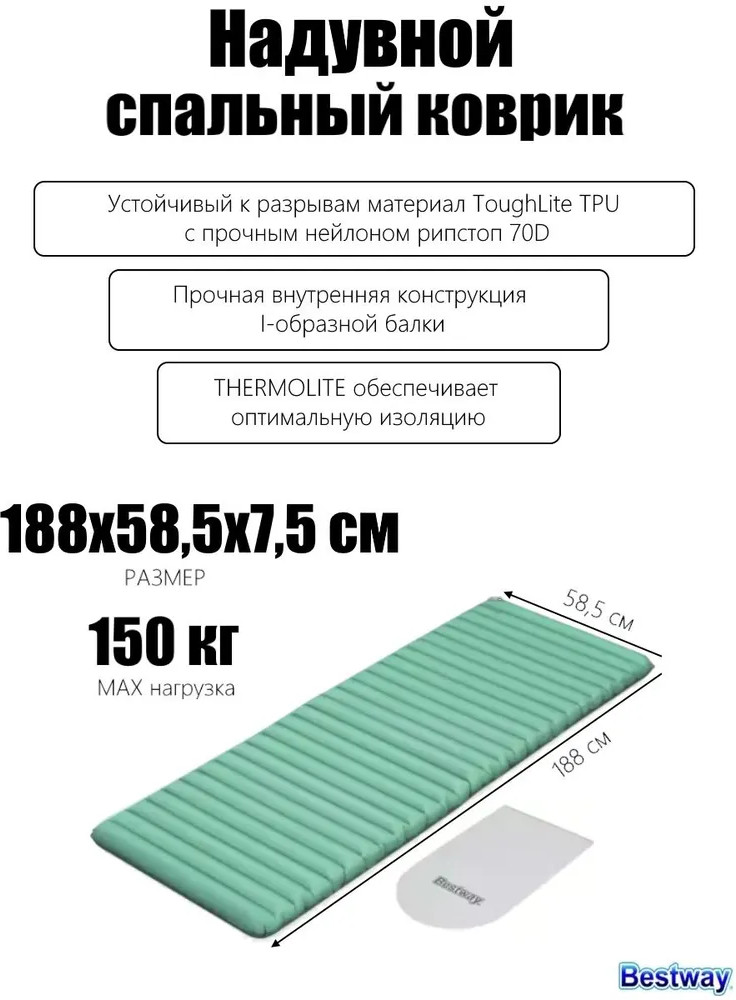 На туристическом коврике Bestway Вы ощутите максимальный комфорт во время сна даже в суровых условиях похода. Он не занимает много места, и его удобно брать с собой. Благодаря качественным материалам коврик прослужит Вам не один сезон, сохранив свои теплоизоляционные свойства. Размер коврика обеспечивает достаточно места для одного человека. Коврик самонадувающийся, что значительно упрощает процесс подготовки к сну. Изготовлен из прочных и легких материалов. Коврик обеспечивает надежную поддержку и изоляцию от холода и влаги.