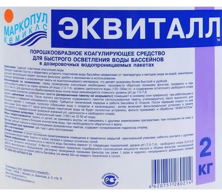 Препарат позволяет быстро и эффективно устранить помутнение воды бассейна независимо от температуры и методов ухода за водой и значительно улучшает фильтрующий эффект песчаных фильтров, а также удобен и экономичен в использовании. Препарат расфасован в дозировочные пакеты из водопроницаемого материала, что делает дозировку более быстрой и удобной.