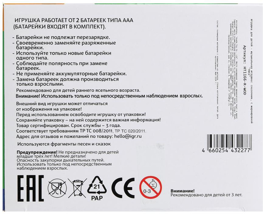💳 Оплатить за товар можно при получении 🇰🇿 Есть бесплатная доставка по Казахстану от 1 дня 🎁 Копите бонусы с каждой покупки Серия: Буба Развивающая игрушка «Буба-сказочник» ТМ «УМка» станет прекрасным подарком для маленьких поклонников популярного мультсериала. Вашего малыша приведёт в восторг эта игрушка в виде забавного домового из популярного мультсериала с тремя крупными кнопками разной формы. Он с удовольствием будет нажимать на эти кнопки и слушать весёлые песенки и увлекательные сказки. А наличие световых эффектов сделает игру с Бубой ещё интереснее. Музыкальная игрушка ТМ «УМка» способствует развитию: слухового восприятия и музыкального слуха, тактильных навыков, визуального восприятия, логического мышления и мелкой моторики. |