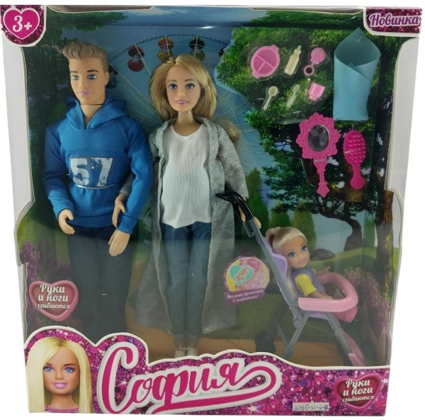 Набор кукол «Беременная София, Алекс и дочь» ТМ «Карапуз» станет прекрасным подарком для вашей принцессы. У кукол сгибаются руки и ноги. Малыш прячется в животике. На семейную прогулку София подобрала комфортный базовый образ, состоящий из белой блузы, длинного серого кардигана и практичных джинс. Алекс предпочёл удобную синюю толстовку с крупным принтом в виде цифр и брюки. А их дочка одета в яркую футболку и брючки. Одежду легко снять и надеть.