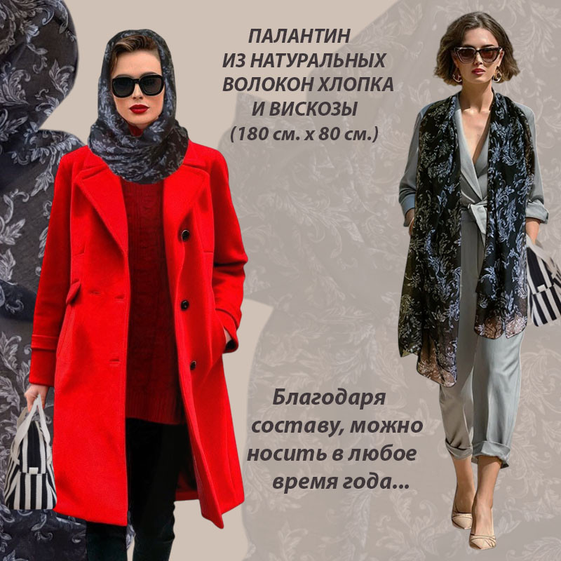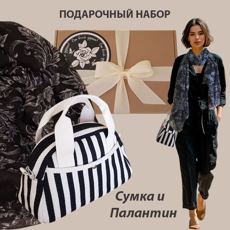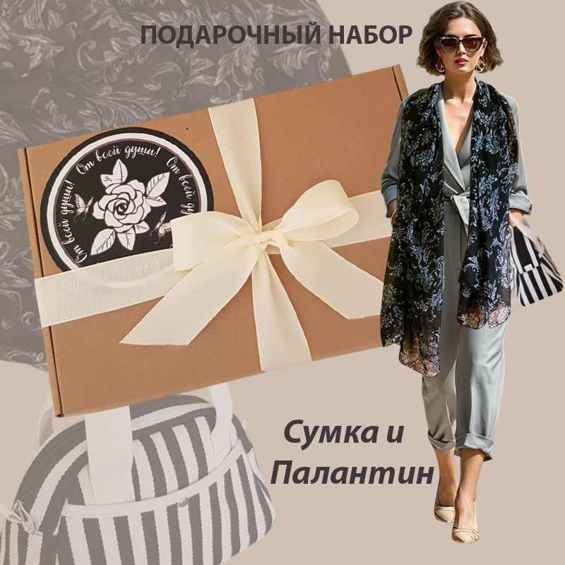 Представляемый подарочный набор состоит из комплекта: сумка (28×11×17 см) и палантин (180×80 см), которые безупречно дополняют друг друга. Палантин соткан из смеси натуральных волокон хлопка и вискозы — он удивительно нежный, легкий и приятный на ощупь. Рисунок палантина имеет всегда актуальный растительный принт и выполнен в универсальном черном цвете. Стильная текстильная сумка с двумя ручками, выполнена во французском стиле. Носится на руке и локте.