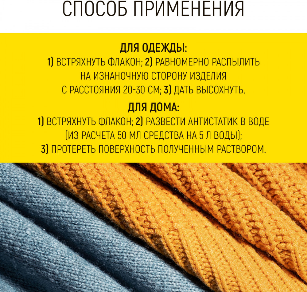 Для ухода за тканями рекомендуется распылить средство на изнаночную сторону изделия с расстояния 20–30 см и дать высохнуть. Для ухода за поверхностями антистатик разводят в пропорции 50 мл средства на 5 литров воды, после чего обрабатывают нужную область. Продукт сертифицирован, безопасен для человека и окружающей среды. Его состав включает 30% деминерализованной воды, придающей ткани мягкость, менее 5% катионных ПАВ — активных компонентов, снимающих статическое электричество, а также консервант, обеспечивающий длительный срок хранения. Благодаря сочетанию эффективности и бережного воздействия, этот антистатик станет надежным помощником в уходе за вещами и поддержании чистоты в доме.