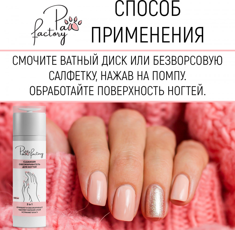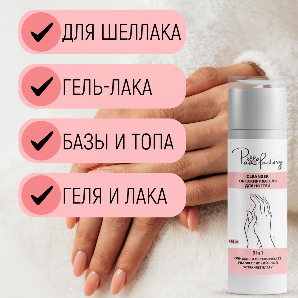 Универсальное косметическое средство ухода, которое используется перед нанесением каучуковой базы, гель — лака или полигеля. Оно помогает очистить поверхность ногтей от жира, пыли и остатков кожи, улучшая адгезию между декоративным покрытием и ногтевой пластиной, не оказывая негативного влияния на ее структуру. Флакон с жидкостью для обезжиривания оснащен дозатором, что позволяет удобно выдавать необходимое количество продукта на безворсовую салфетку или ватный диск.