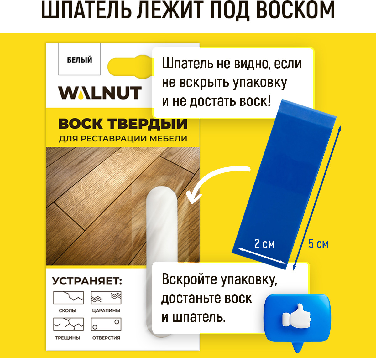 Для применения продукта необходимо расплавить восковой брусок с помощью зажигалки или паяльника, нанести его на повреждённую поверхность с помощью шпателя, а через несколько секунд удалить излишки тем же шпателем или спиртовой жидкостью. Завершив реставрацию, рекомендуется отполировать поверхность до получения идеально гладкой структуры. Чтобы восстановить текстуру древесины или рисунок, можно воспользоваться специальным маркером, а затем закрепить результат лаком, несколькими слоями краски или мебельной замазкой. В нашем ассортименте представлены все необходимые элементы ремкомплекта в различных цветовых вариантах. Восковой мелок станет надёжным решением для поддержания порядка и аккуратности на кухне, в гостиной, прихожей и других помещениях. Этот практичный отделочный материал идеально подходит для оперативного косметического ремонта мебели и бытовых поверхностей и станет отличным выбором для тех, кто хочет вернуть предметам интерьера их первоначальный вид и продлить срок службы.