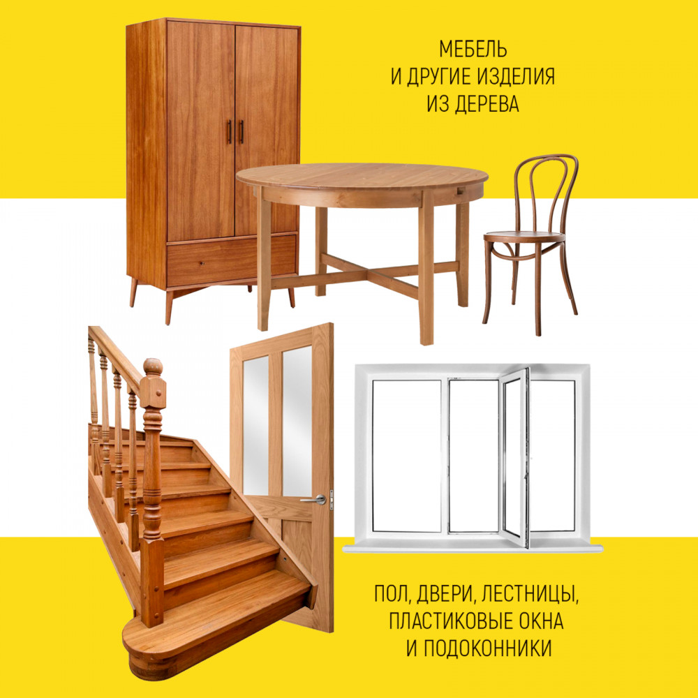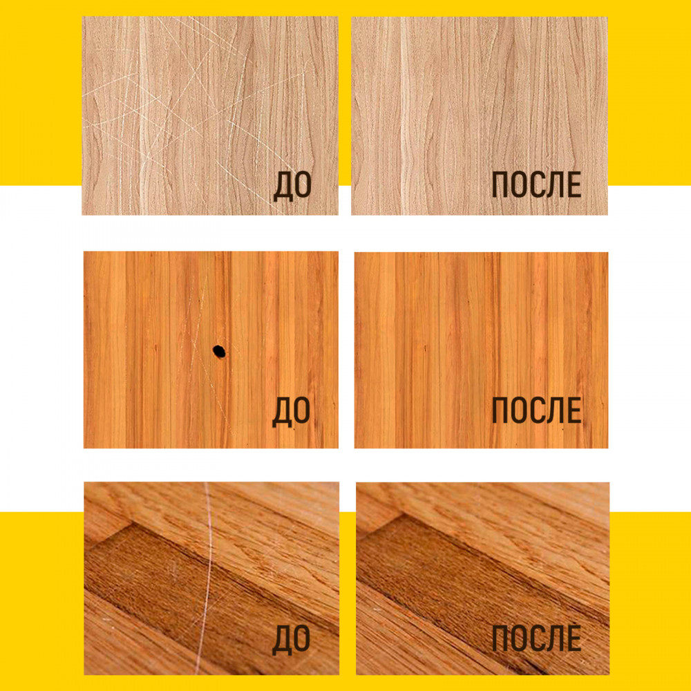 Мебельный воск — незаменимый помощник для реставрации и ухода за деревянными и ламинированными изделиями. Он отлично подходит для восстановления внешнего вида стульев, комодов, столешниц и другой мебели, а также применяется при обновлении покрытия оконных рам, дверей и декоративных интерьерных предметов из дерева или пластика. Твёрдый воск используется для заполнения глубоких и средних повреждений на паркете, ламинате и других напольных покрытиях, обеспечивая дополнительную защиту от износа и механических воздействий.