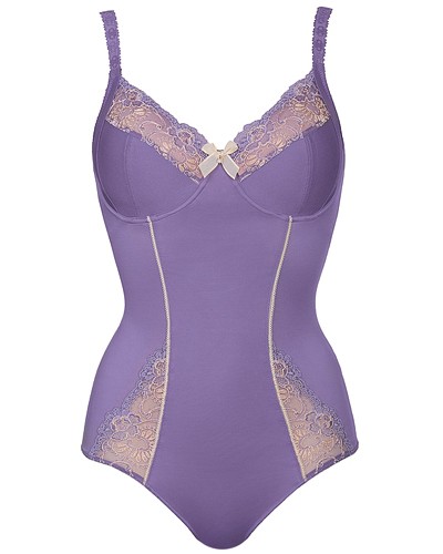 Грация-трусы из эластичного трикотажного полотна, неэластичного трикотажного полотна и неэластичной вышивки. На каркасах. Мягкие чашки с боковой корректирующей деталью. Отделка - бантик с подвеской на центральной детали. Швы декорированы контрастной тесьмой.