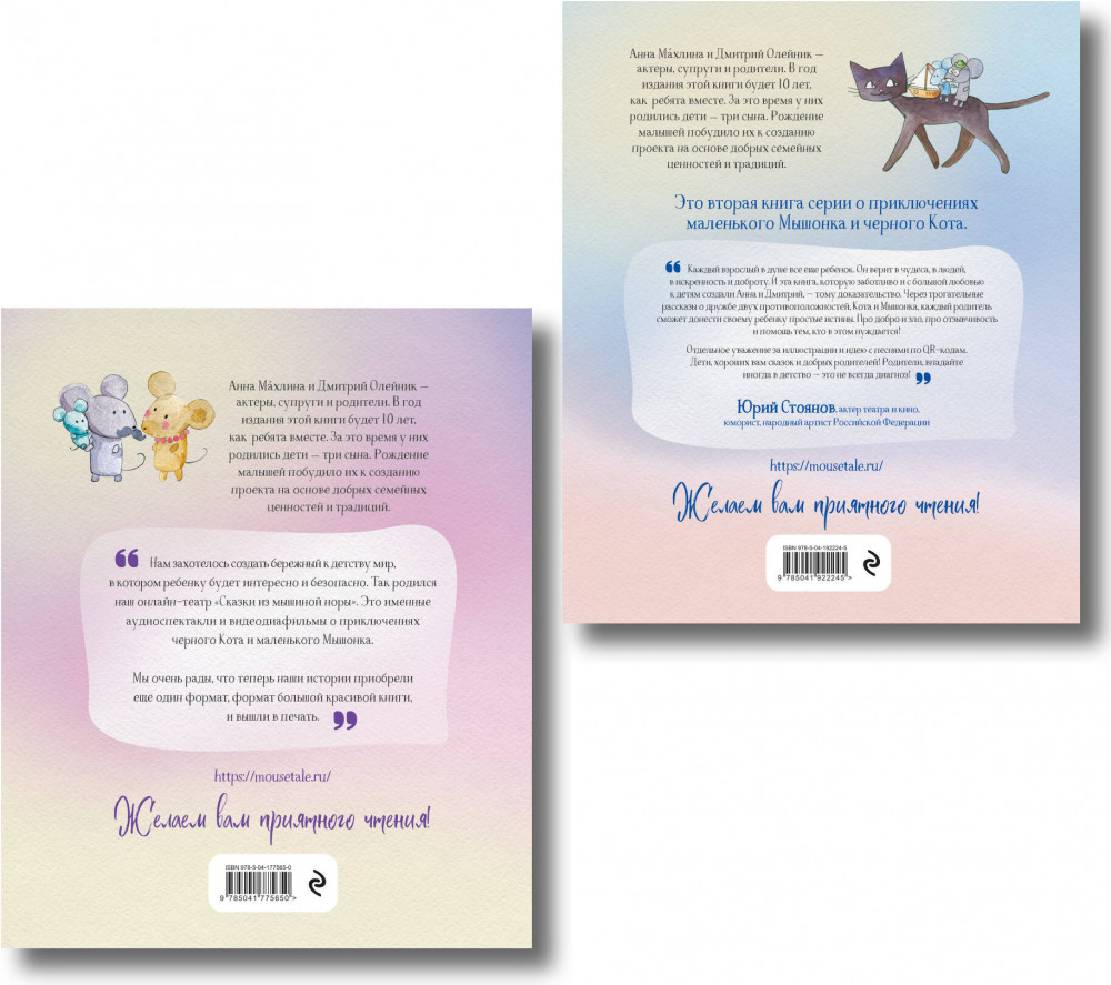 Сказки из Мышиной норы. Комплект из 2 книгАнна Николаевна Махлина, Дмитрий Витальевич Олейник В данный момент этот товар отсутствует в продаже. Возможно, у нас найдется аналогичный или похожий товар здесь. Сказка хранит и питает веру в чудо, добро и волшебство! Под обложкой книги «Сказки из мышиной норы» хранятся волшебные и очень добрые истории о приключеениях мышиного семейства, QR-коды, которые проводят читателя к прослушиванию песен из сказок, прекрасные иллюстрации, которые развивают воображение и чувство прекрасного. |