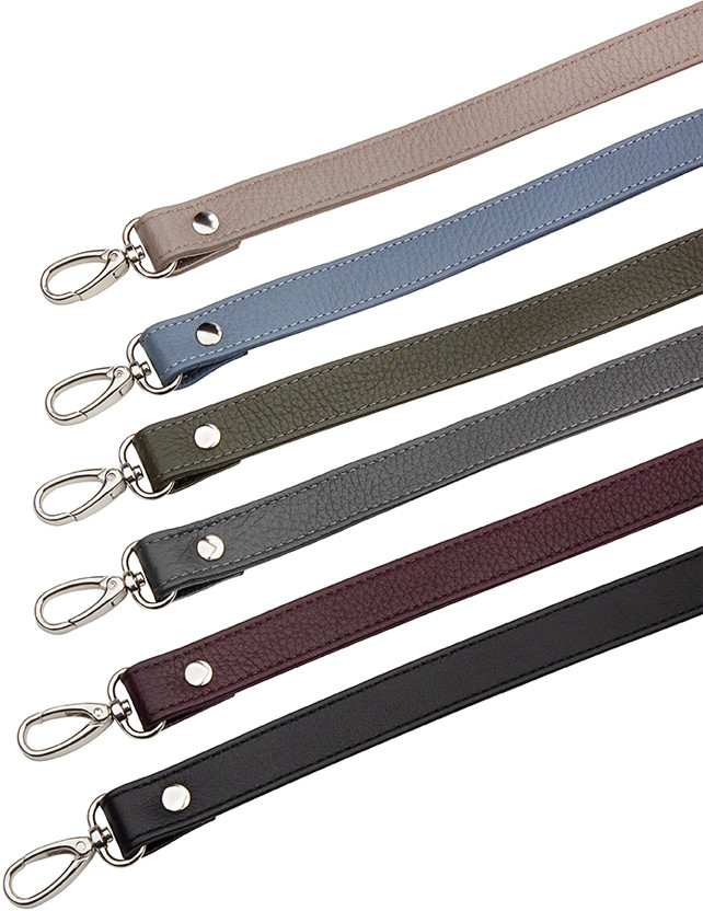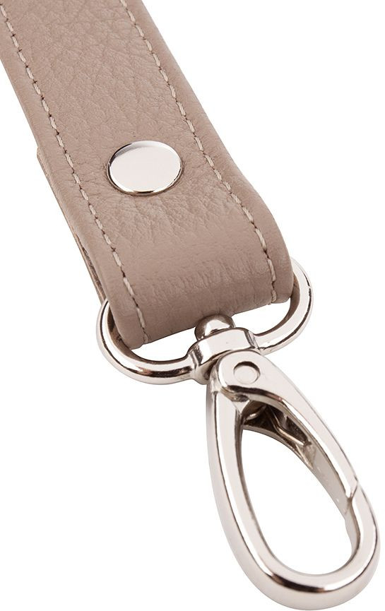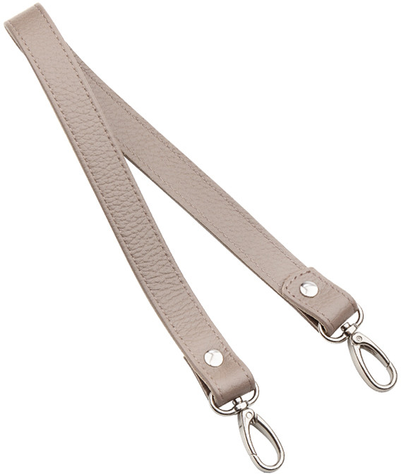 Кожаный двухслойный короткий ремень для сумки. Длина ремня с карабинами 50 см, ширина 2 см. Длина ремня позволяет носить сумку в руке, на сгибе локтя и на плече. Удобные поворотные карабины серебристого цвета.