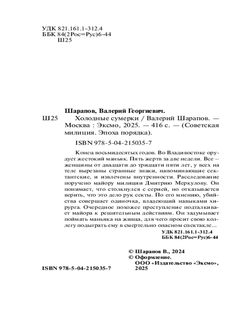 Холодные сумеркиВ данный момент этот товар отсутствует в продаже. Возможно, у нас найдется аналогичный или похожий товар здесь. Серия: Советская милиция. Эпоха порядка (обложка) Конец восьмидесятых годов. Во Владивостоке орудует жестокий маньяк. Пять жертв за две недели. Все — женщины от двадцати до тридцати пяти лет, у всех на теле вырезаны странные знаки, напоминающие сектантские, и извлечены внутренности. Расследование поручено майору милиции Дмитрию Меркулову. Он понимает, что столкнулся с серией, но отказывается верить, что это дело рук секты. По его мнению, убийства совершает одиночка, владеющий навыками хирурга. Очередное похожее преступление подталкивает майора к решительным действиям. Он задумывает поймать маньяка на живца, для чего просит свою коллегу подыграть ему в смертельно опасном спектакле... |