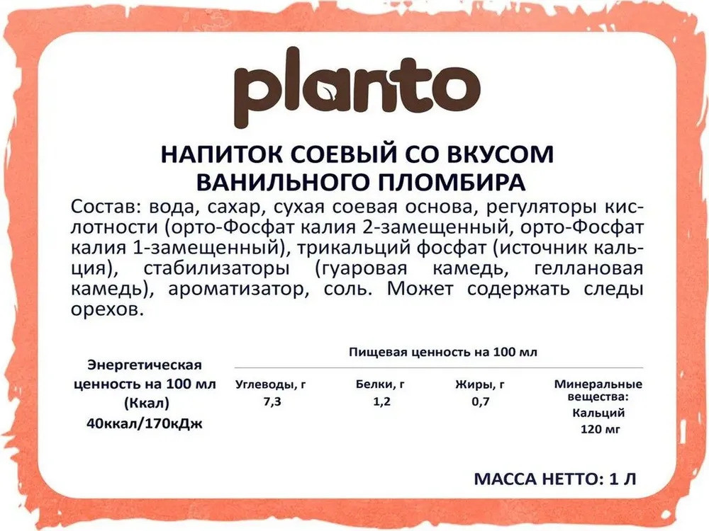 Planto Напиток соевый со вкусом ванильного пломбира «Vanilla Plombir»