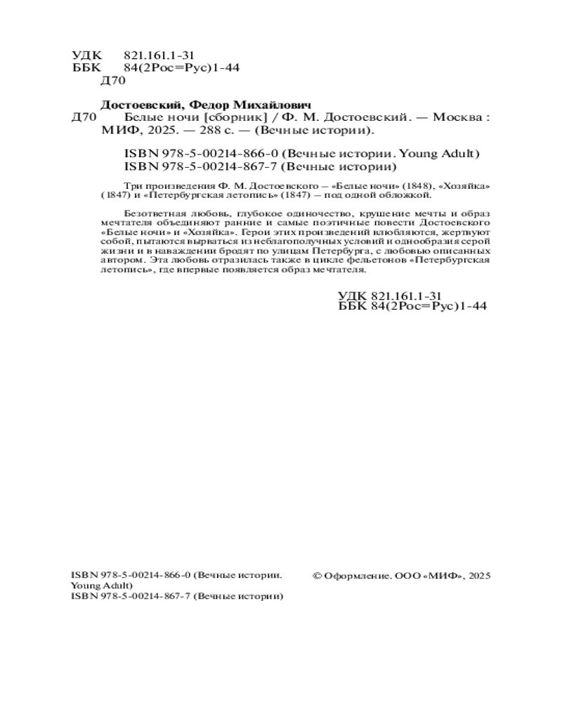 💳 Оплатить за товар можно при получении 🇰🇿 Есть бесплатная доставка по Казахстану от 1 дня 🎁 Копите бонусы с каждой покупки Серия: Вечные истории. Young Adult Безответная любовь, глубокое одиночество, крушение мечты и образ мечтателя объединяют ранние и самые поэтичные повести Достоевского «Белые ночи» и «Хозяйка». Герои этих произведений влюбляются, жертвуют собой, пытаются вырваться из неблагополучных условий и однообразия серой жизни и в наваждении бродят по улицам Петербурга, с любовью описанных автором. Эта любовь отразилась также в цикле фельетонов «Петербургская летопись», где впервые появляется образ мечтателя. |
