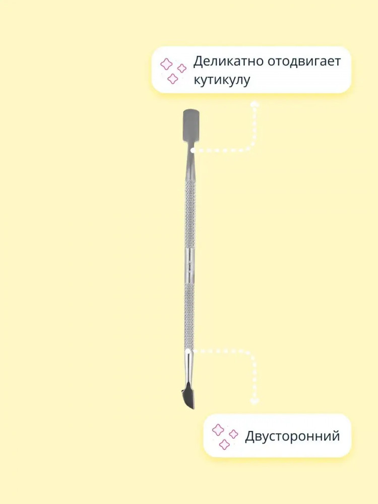 Пушер для кутикулы двустороннийВ данный момент этот товар отсутствует в продаже. Возможно, у нас найдется аналогичный или похожий товар здесь. Пушер для кутикулы двусторонний поможет деликатно отодвинуть кутикулу до основания ногтя. Для достижения наилучшего результата перед удалением кутикулы размягчите ее при помощи расслабляющей ванночки или специальным средством. |