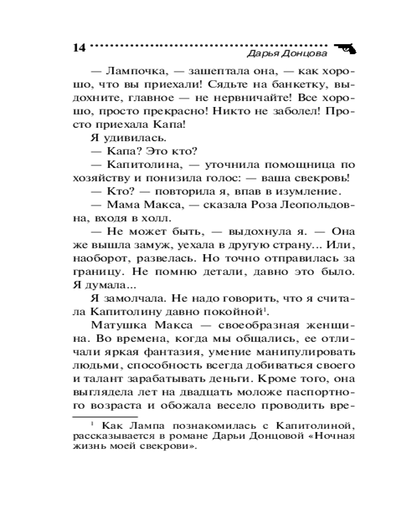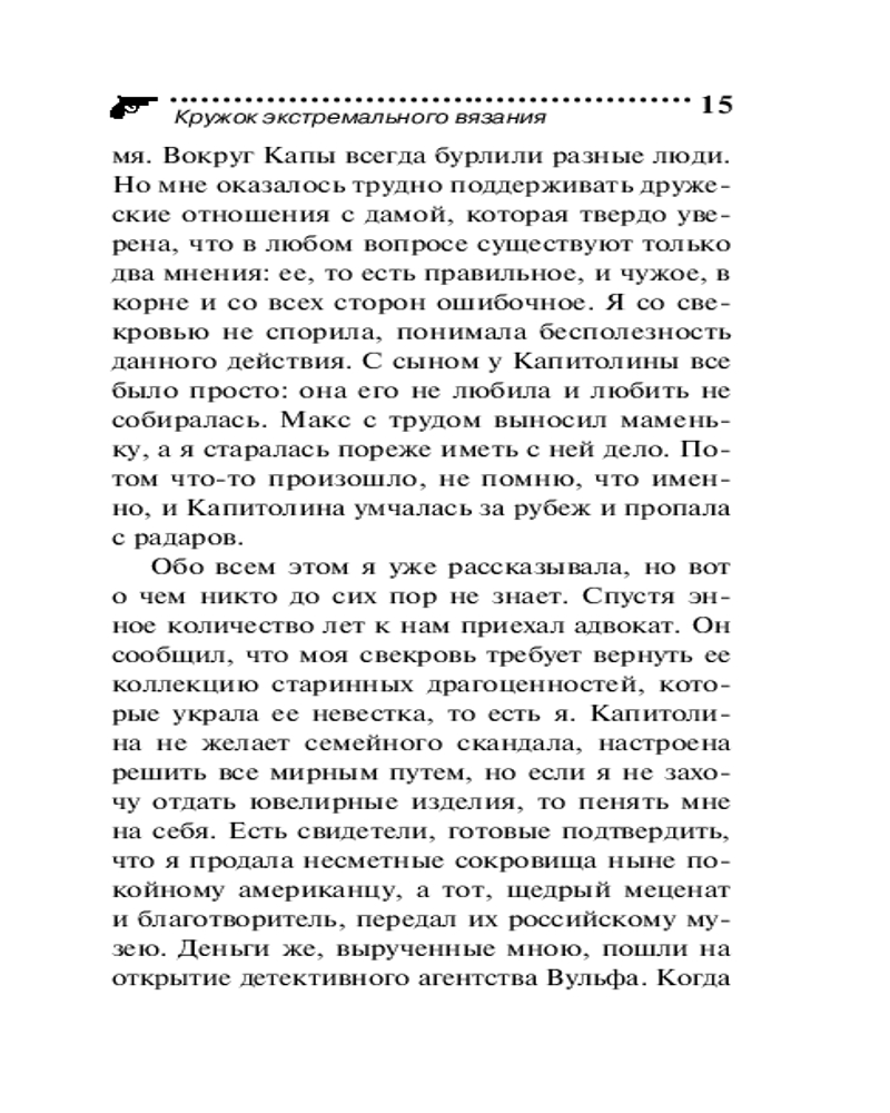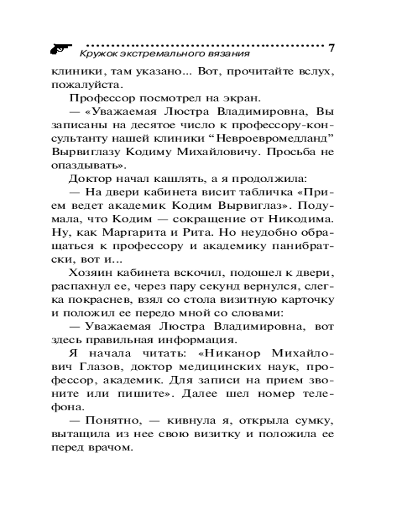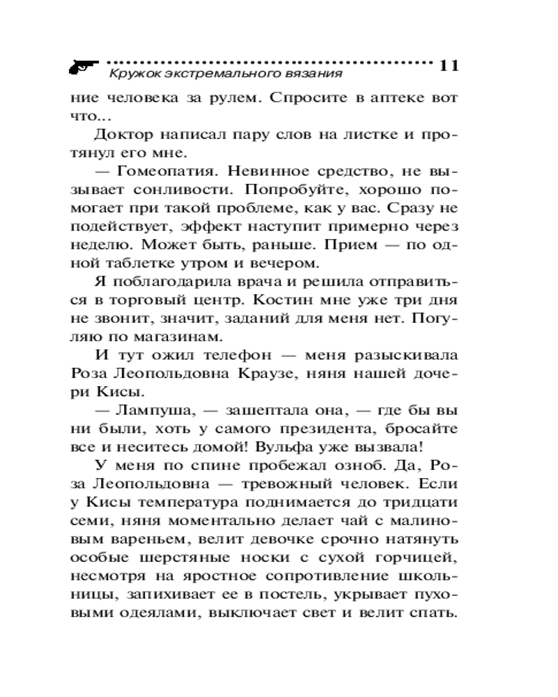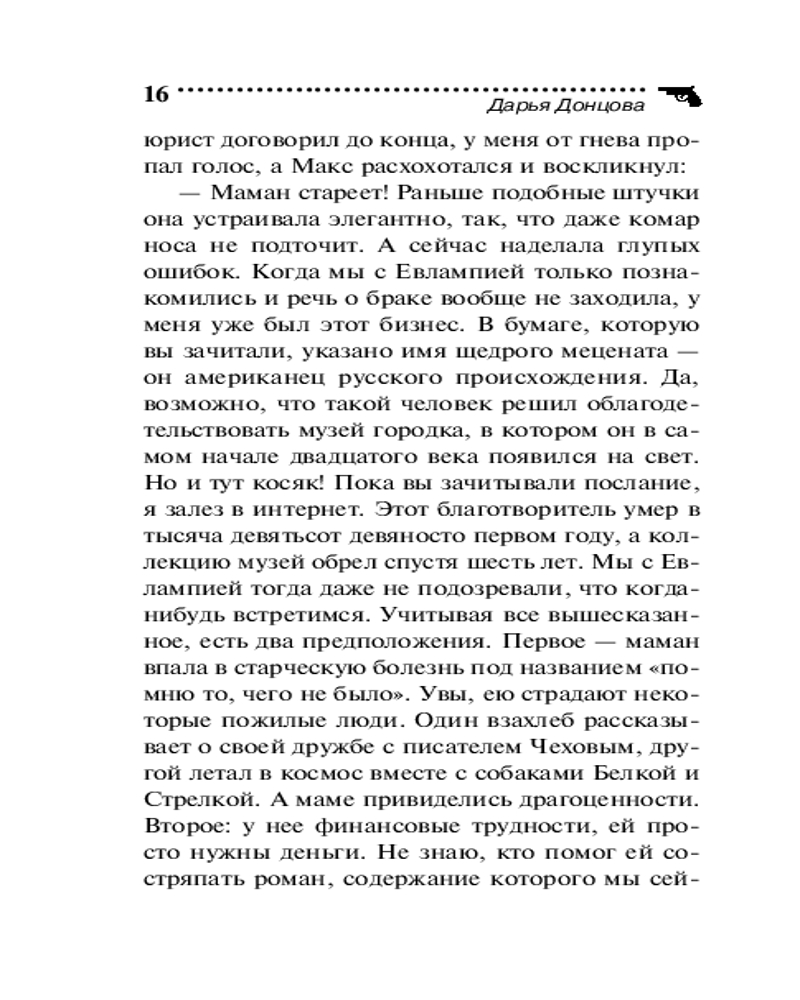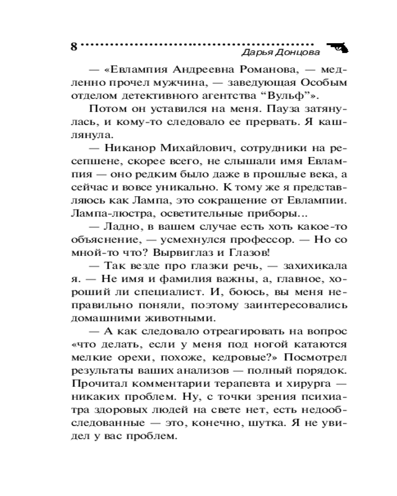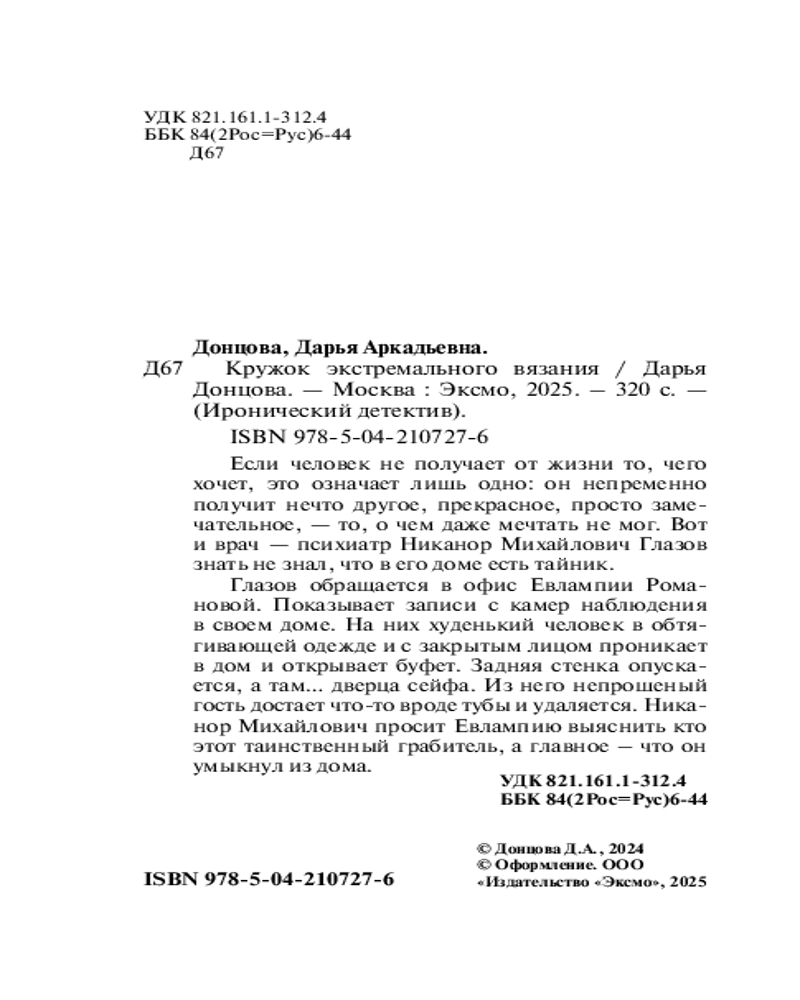 💳 Оплатить за товар можно при получении 🇰🇿 Есть бесплатная доставка по Казахстану от 1 дня 🎁 Копите бонусы с каждой покупки Серия: Иронический детектив (обложка) Если человек не получает от жизни то, что хочет, это означает лишь одно: он непременно получит нечто другое, прекрасное, просто замечательное, то, о чем даже мечтать не мог. Вот и врач-психиатр Никанор Михайлович Глазов знать не знал, что в его доме есть тайник. Глазов обращается в офис Евлампии Романовой. Показывает записи с камер наблюдения в своем доме. На них худенький человек в обтягивающей одежде и с закрытым лицом проникает в дом и открывает буфет. Задняя стенка опускается, а там... дверца сейфа. Из него непрошеный гость достает что-то вроде тубы и удаляется. Никанор Михайлович просит Евлампию выяснить, кто этот таинственный грабитель, а главное — что он умыкнул из дома? |