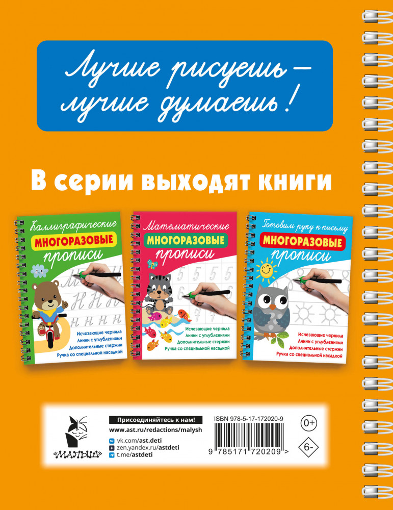 💳 Оплатить за товар можно при получении 🇰🇿 Есть бесплатная доставка по Казахстану от 1 дня 🎁 Копите бонусы с каждой покупки Серия: Чудо-прописи с волшебными чернилами «Необыкновенные рисунки: Многоразовые прописи» — рабочая тетрадь большого формата для подготовки руки к письму, развития речи, внимания, памяти, логики, воображения и мелкой моторики. Картинки-обводилки с углублениями и исчезающие чернила — дошколята будут в восторге: прямо на страницах можно рисовать хоть тысячу раз! Заниматься очень удобно — благодаря спирали страницы легко перекидываются из стороны в сторону, открываясь на 360 градусов. |