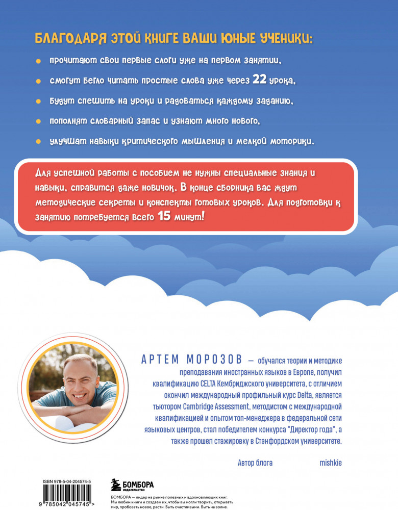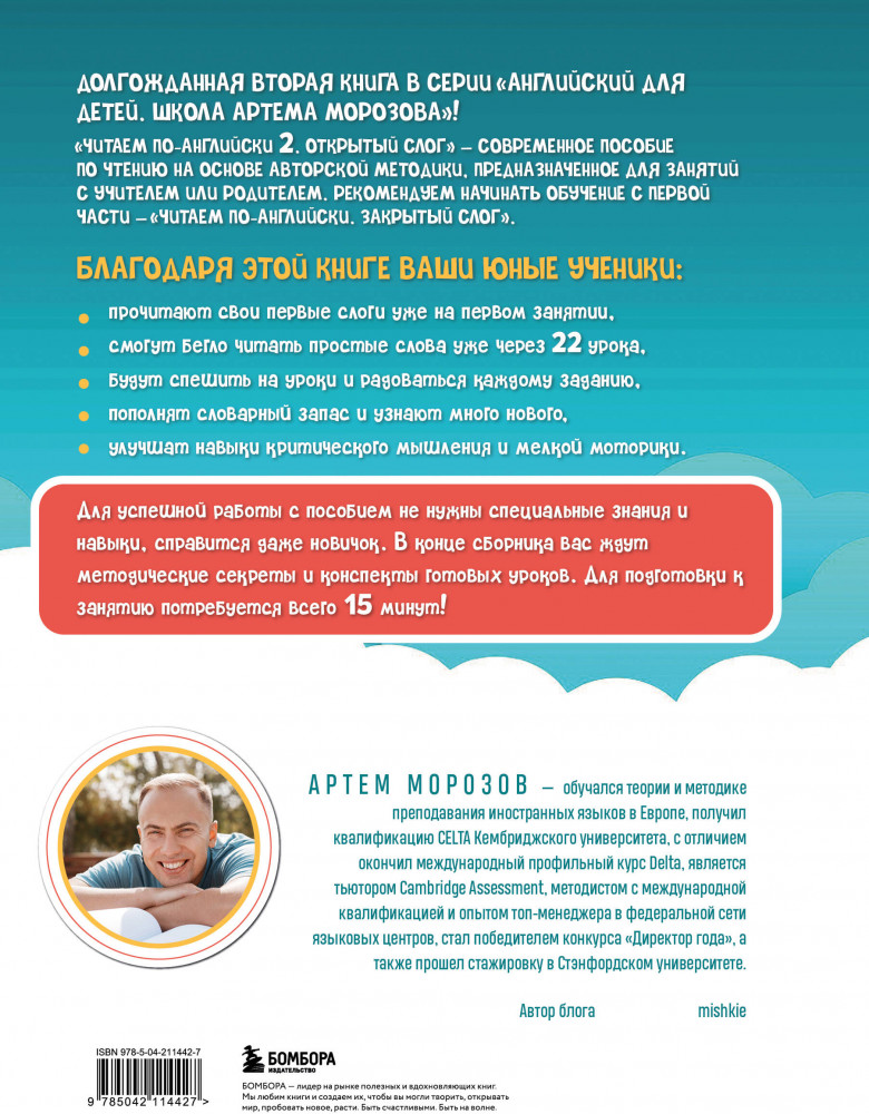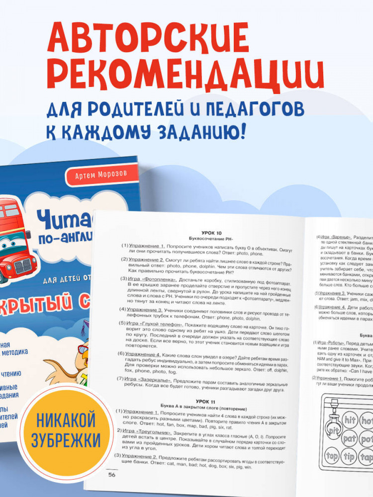 В данный момент этот товар отсутствует в продаже. Возможно, у нас найдется аналогичный или похожий товар здесь. Серия: Английский для детей. Школа Артема Морозова Комлпект книг «Читаем по-английски. Закрытый и открытый слог» включает две части из цикла обучающих книг по чтению для детей от Артема Морозова. Новаторской методике сертифицированного преподавателя с квалификацией DELTA Кембриджского Университета доверяют более 119 тысяч педагогов и родителей. Благодаря разнообразным упражнениям, развивающим мелкую моторику, воображение и пространственное мышление, а также отказу от транскрипции обучение приносит ребятам удовольствие, и результат не заставляет себя долго ждать. Пособия подойдут как ученикам младшей школы, так и дошкольникам. Для родителей и учителей в конце даны рекомендации по проведению занятий и ответы на задания. |