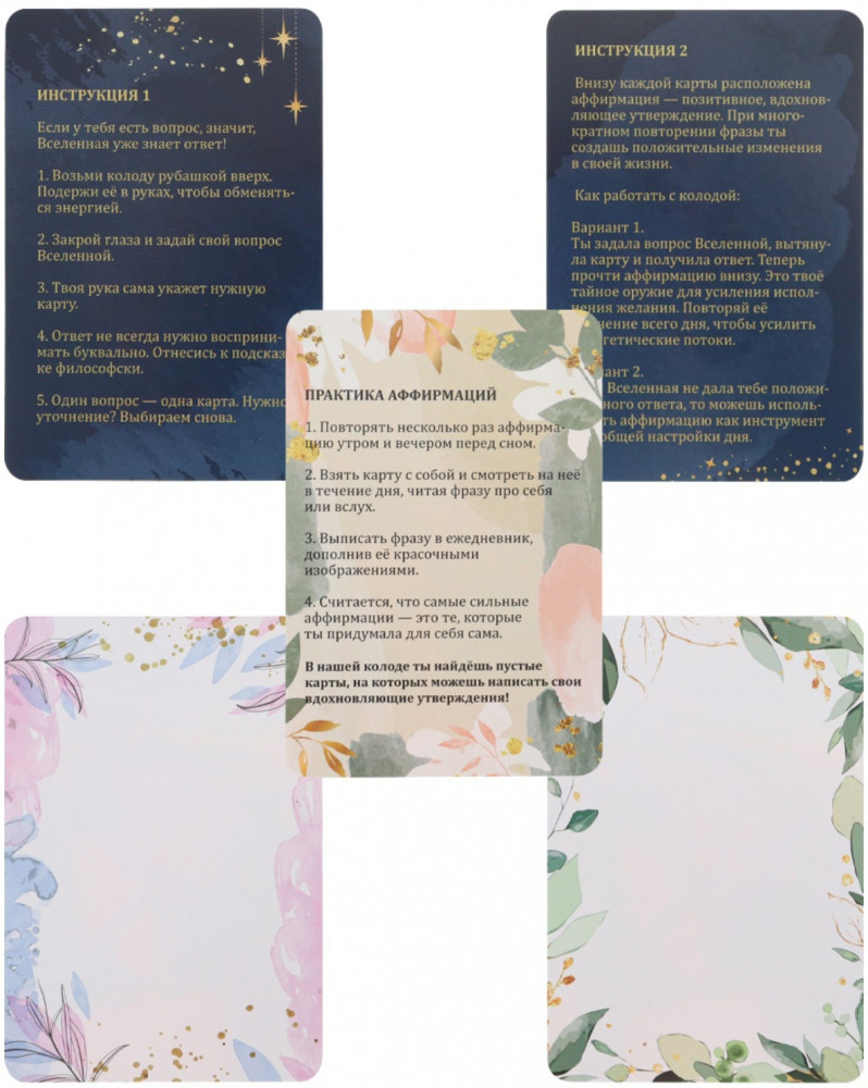 💳 Оплатить за товар можно при получении 🇰🇿 Есть бесплатная доставка по Казахстану от 1 дня 🎁 Копите бонусы с каждой покупки Метафорические ассоциативные карты МАК «Твоя Вселенная» Это колода из 67 вдохновляющих карточек с посланиями от Вселенной для процветания и уверенности в своих силах. Число 67 имеет тайный смысл — это знак ангелов-хранителей, которые всегда рядом. Они даруют силу и удачу, поддерживают в трудные минуты. По центру каждой карты написан ответ Вселенной на вопрос. Внизу карты располагаются аффирмации. Они помогут воплотить в реальность даже самые смелые желания и наполнят жизнь позитивной энергией. |