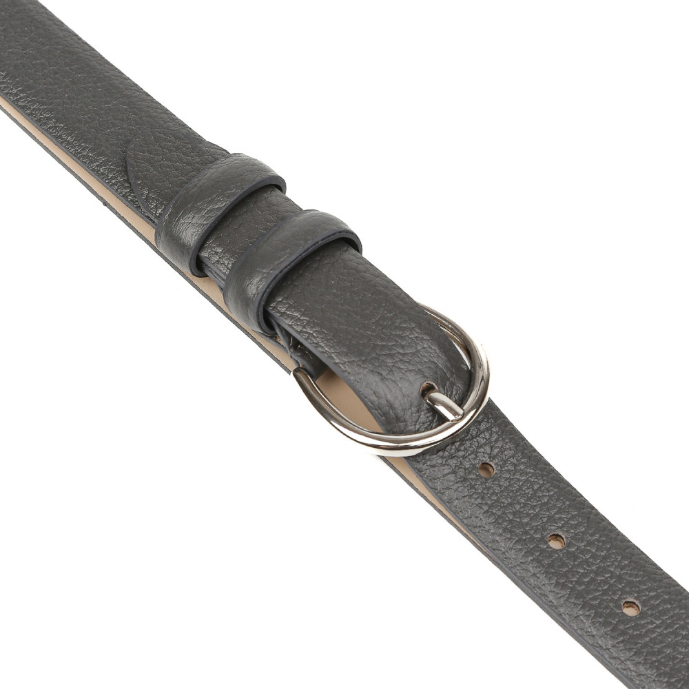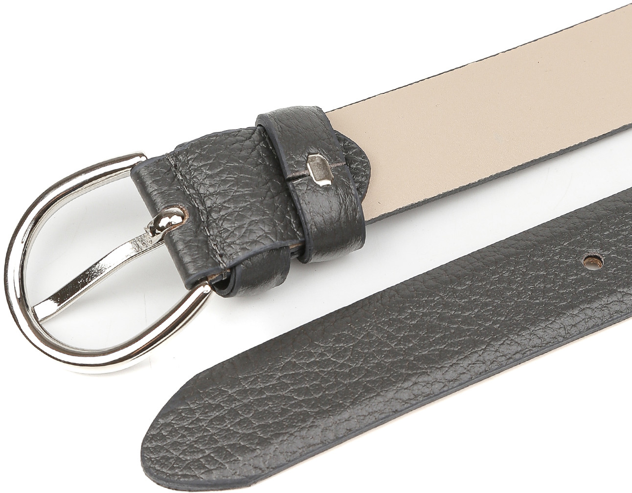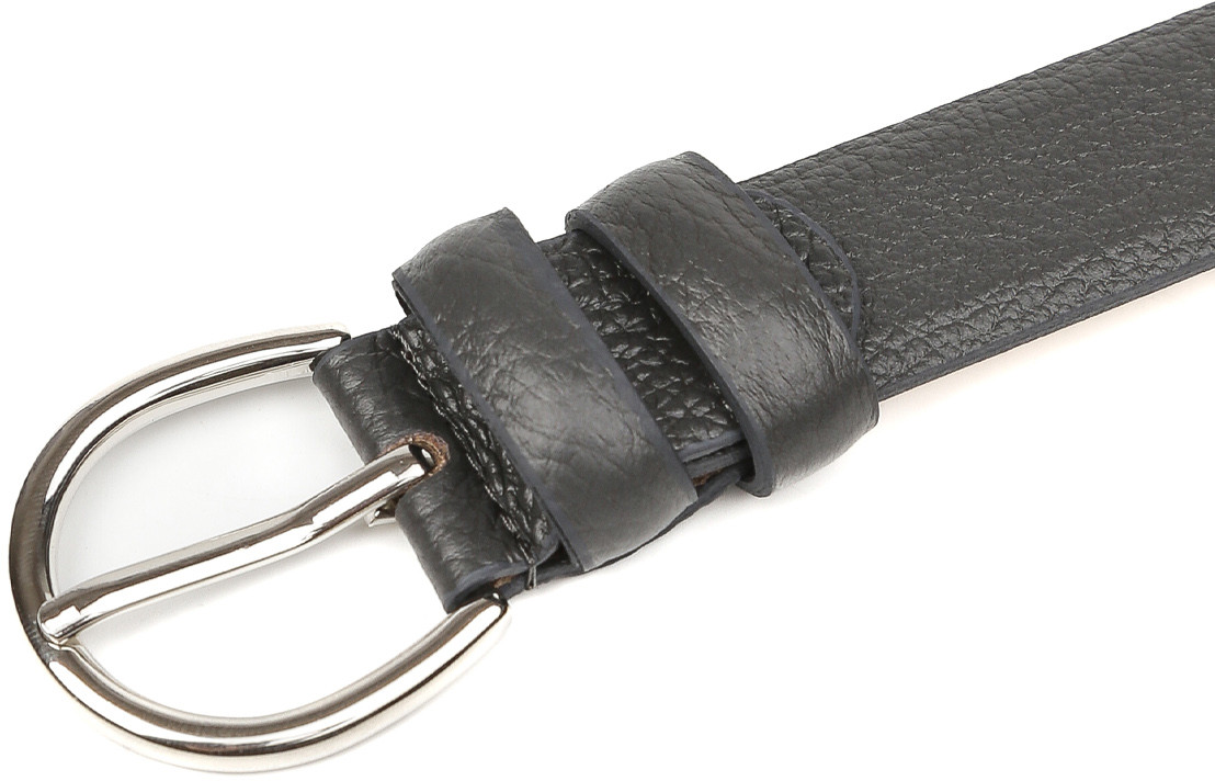 Дутый ремень в темно-сером оттенке выполнен из мягкой зернистой кожи. Тыльная сторона — из гладкого плотного спила. Модель дополнена полукруглой пряжкой из прочного гальванического сплава с покрытием — серебро. Пряжка крепится к изделию с помощью винта, что позволяет легко отрегулировать длину. Две шлевки из зернистой кожи в тон изделию: одна закреплена, вторая — подвижная.