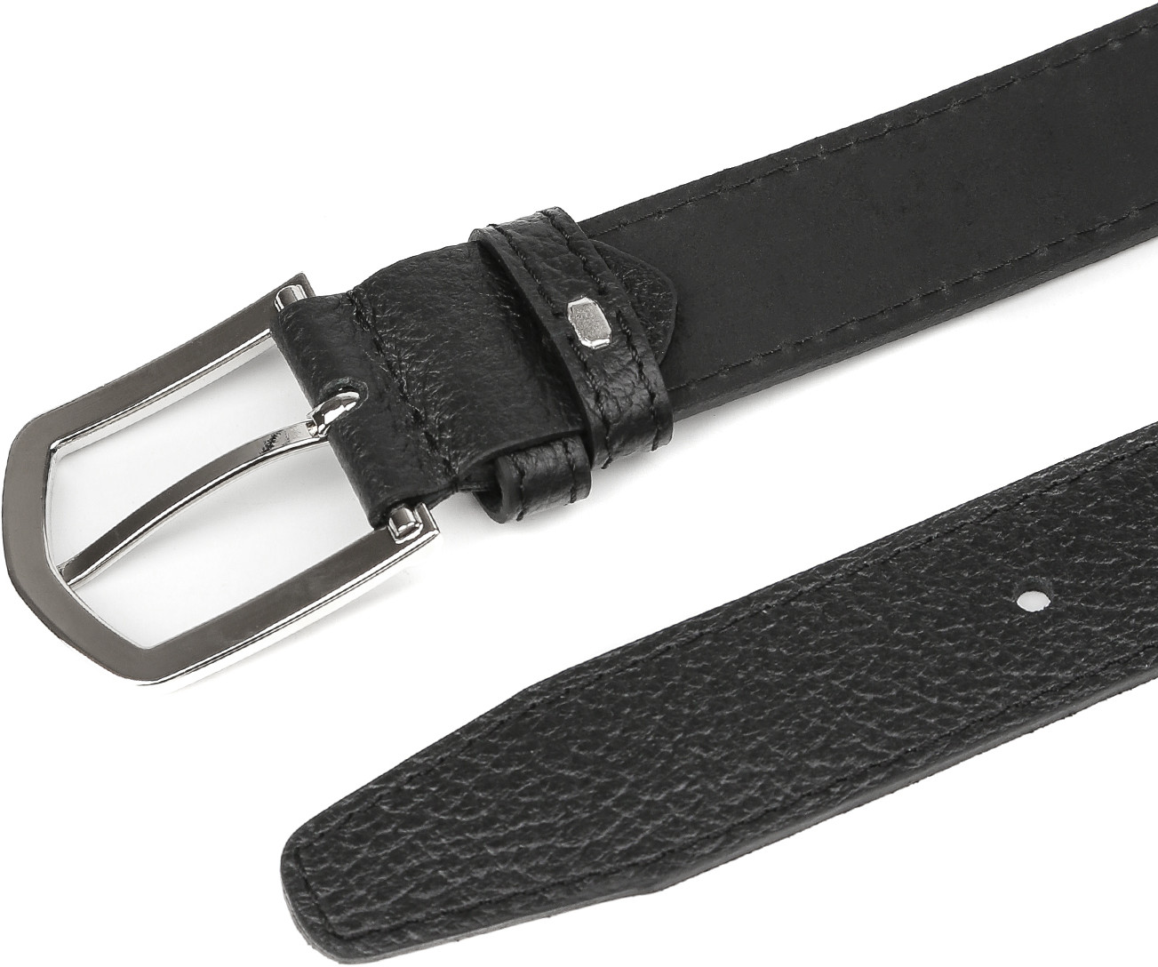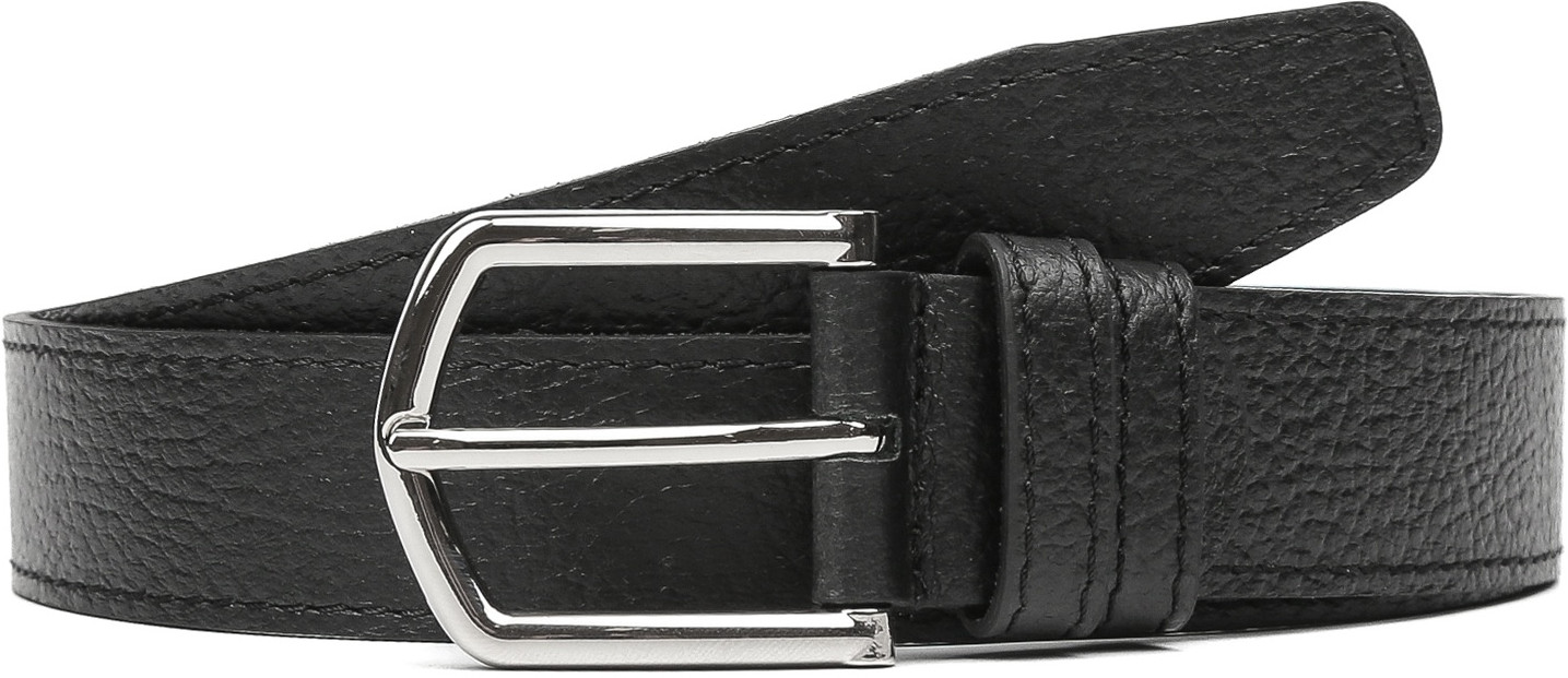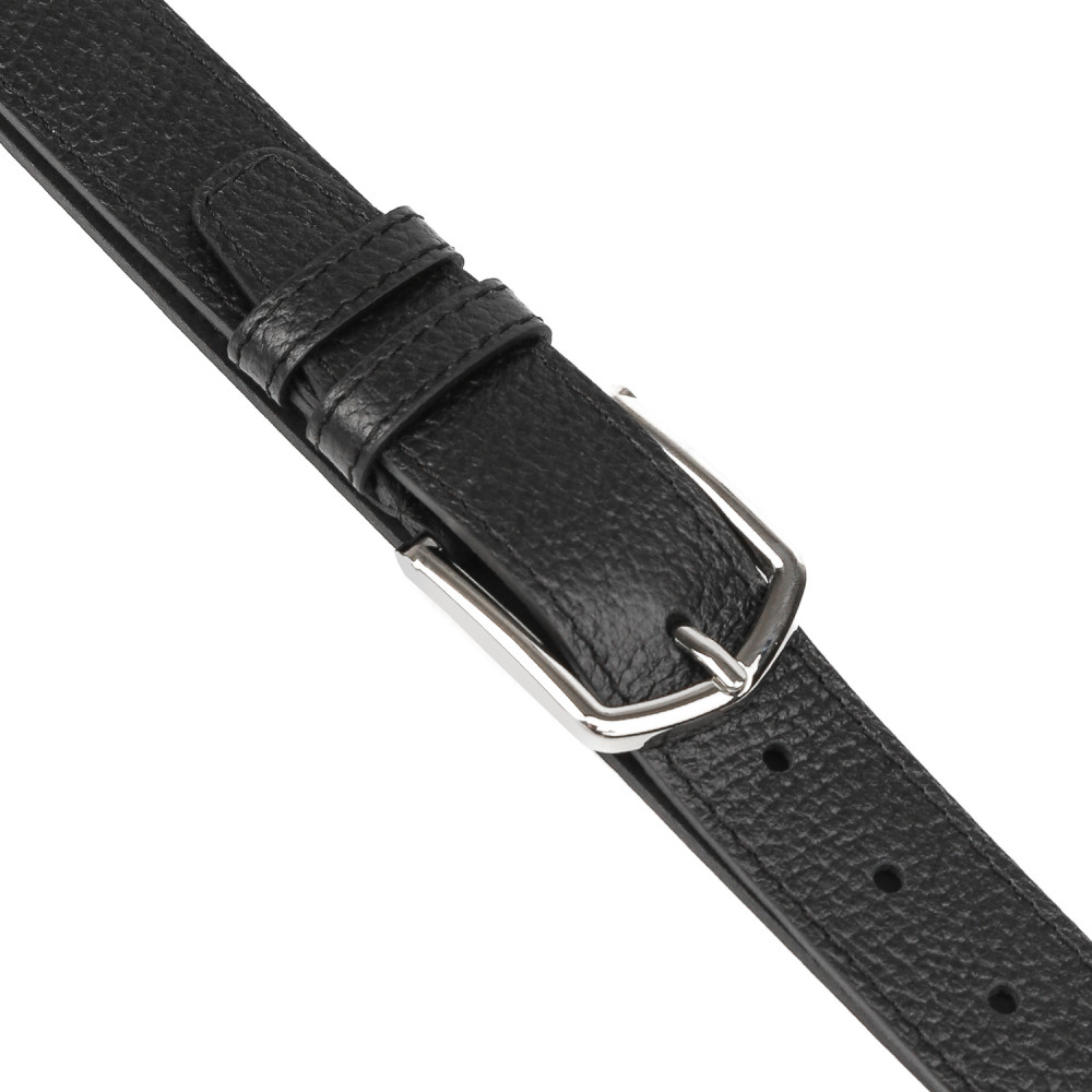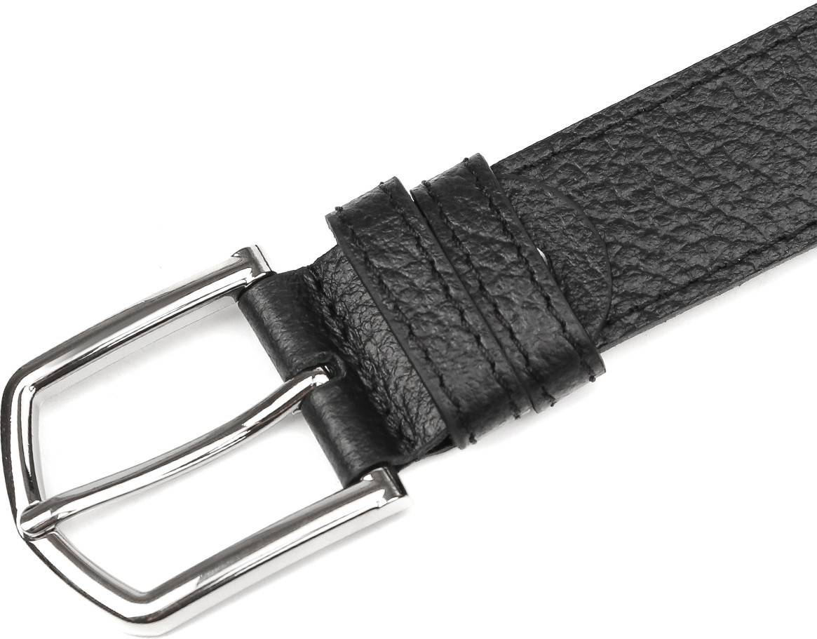 Стильный ремень в черном цвете выполнен из мягкой зернистой кожи и декорирован отстрочками — по одной с каждого края. Тыльная сторона — из гладкого плотного спила. Модель дополнена прямоугольной пряжкой из прочного гальванического сплава с покрытием — серебро. Пряжка крепится к изделию с помощью винта, что позволяет легко отрегулировать длину. Две шлевки из зернистой кожи в тон изделию: одна закреплена, вторая — подвижная.