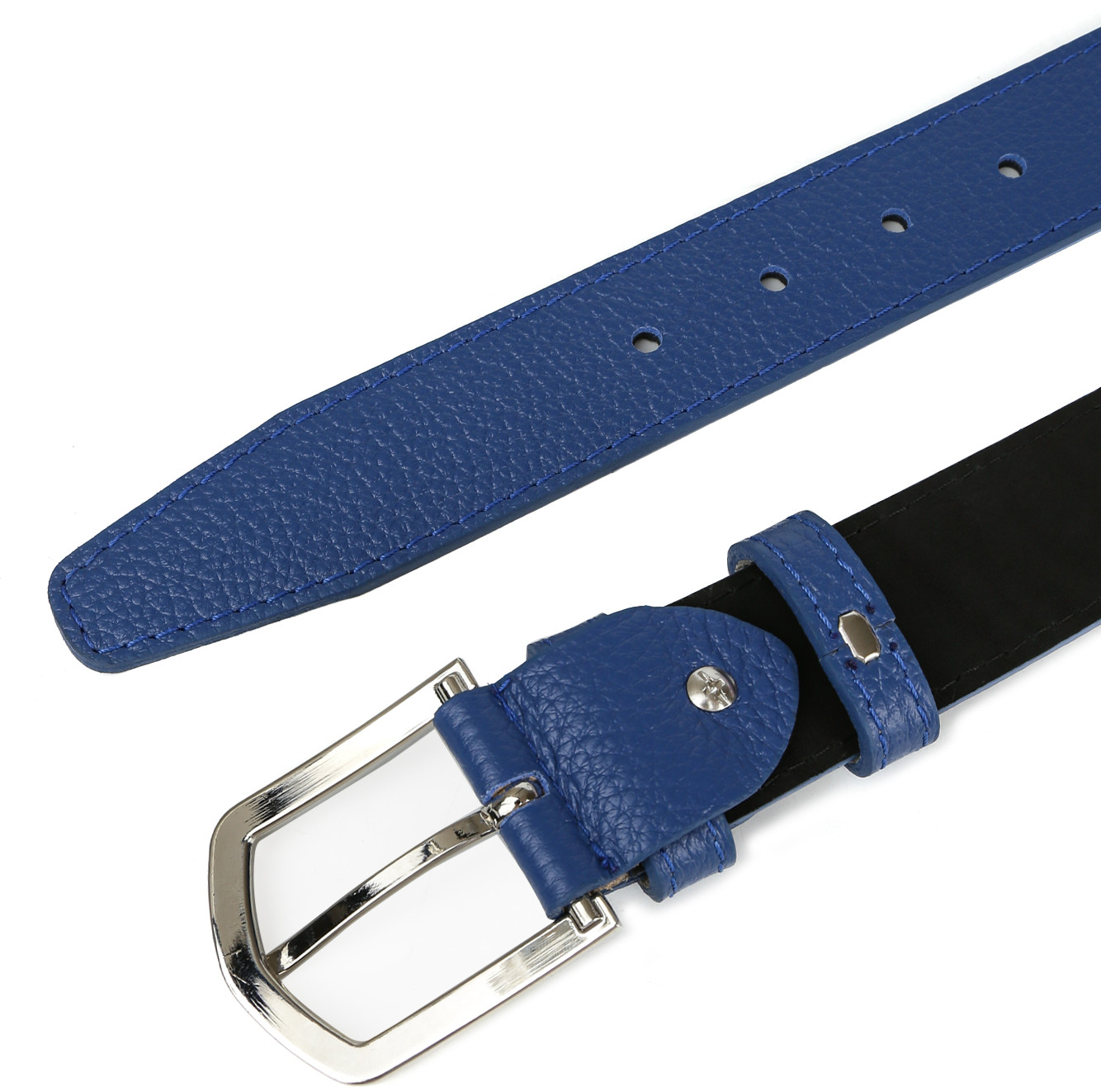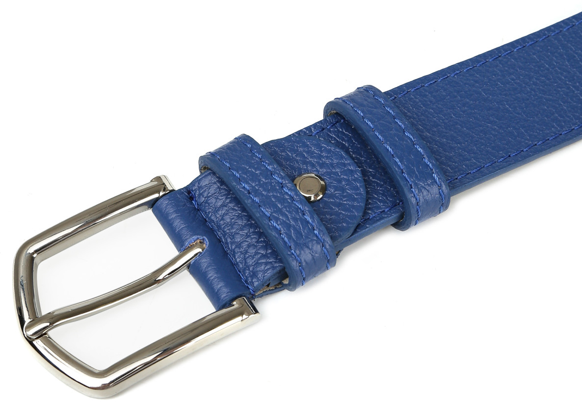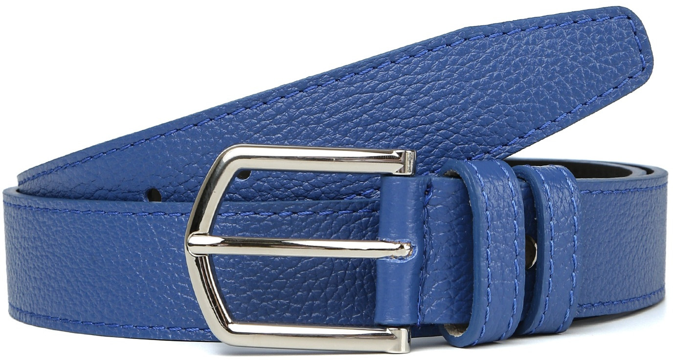 Стильный ремень в синем цвете выполнен из мягкой зернистой кожи и декорирован отстрочками — по одной с каждого края. Тыльная сторона — из гладкого плотного спила. Модель дополнена прямоугольной пряжкой из прочного гальванического сплава с покрытием — серебро. Пряжка крепится к изделию с помощью винта, что позволяет легко отрегулировать длину. Две шлевки из зернистой кожи в тон изделию: одна закреплена, вторая — подвижная.