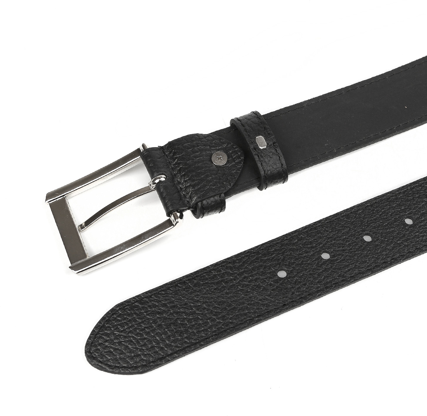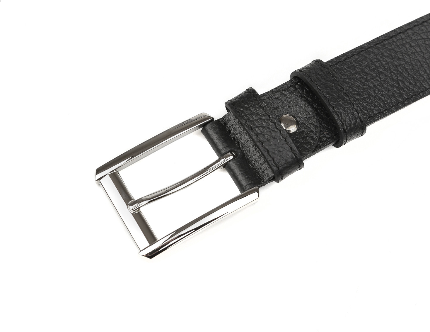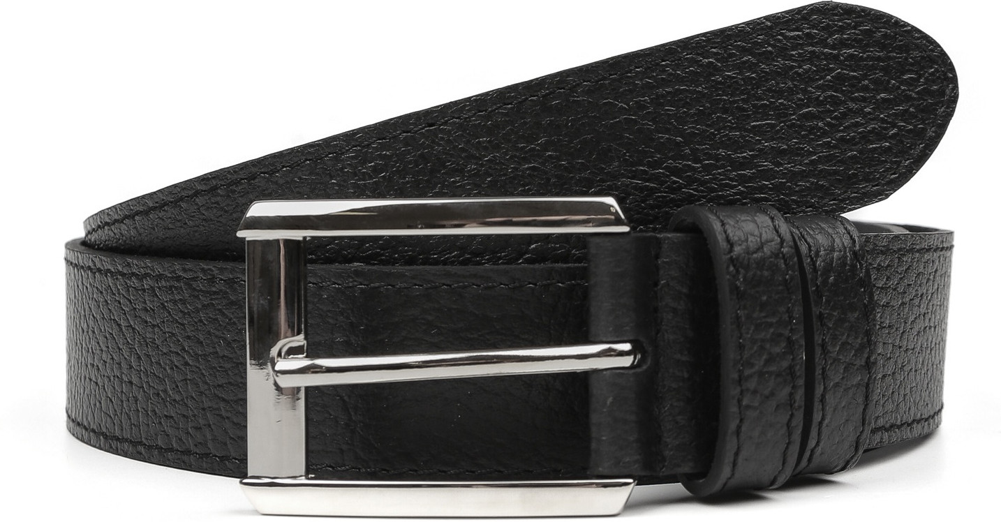 Стильный ремень в черном цвете выполнен из мягкой зернистой кожи и декорирован отстрочками — по одной с каждого края. Тыльная сторона — из гладкого плотного спила. Модель дополнена прямоугольной пряжкой из прочного гальванического сплава с покрытием — серебро. Пряжка крепится к изделию с помощью винта, что позволяет легко отрегулировать длину. Две шлевки из зернистой кожи в тон изделию: одна закреплена, вторая — подвижная.