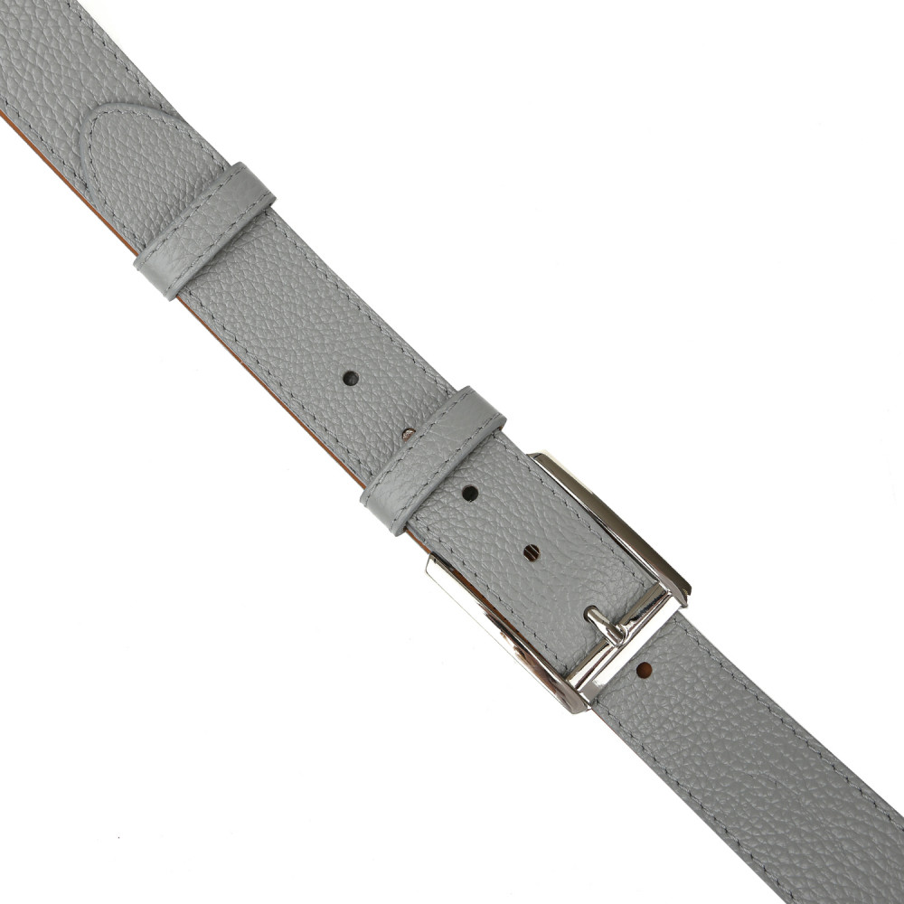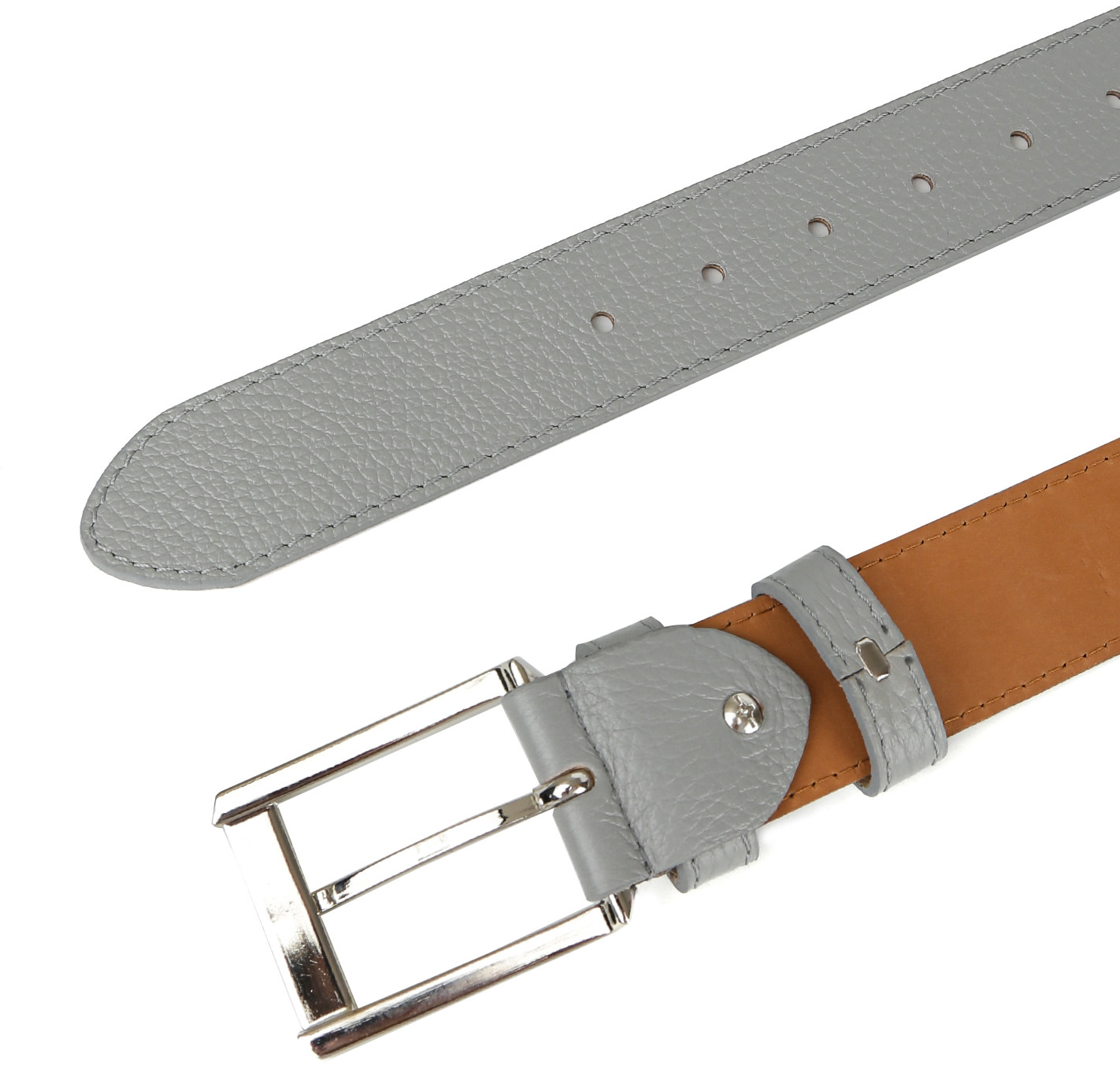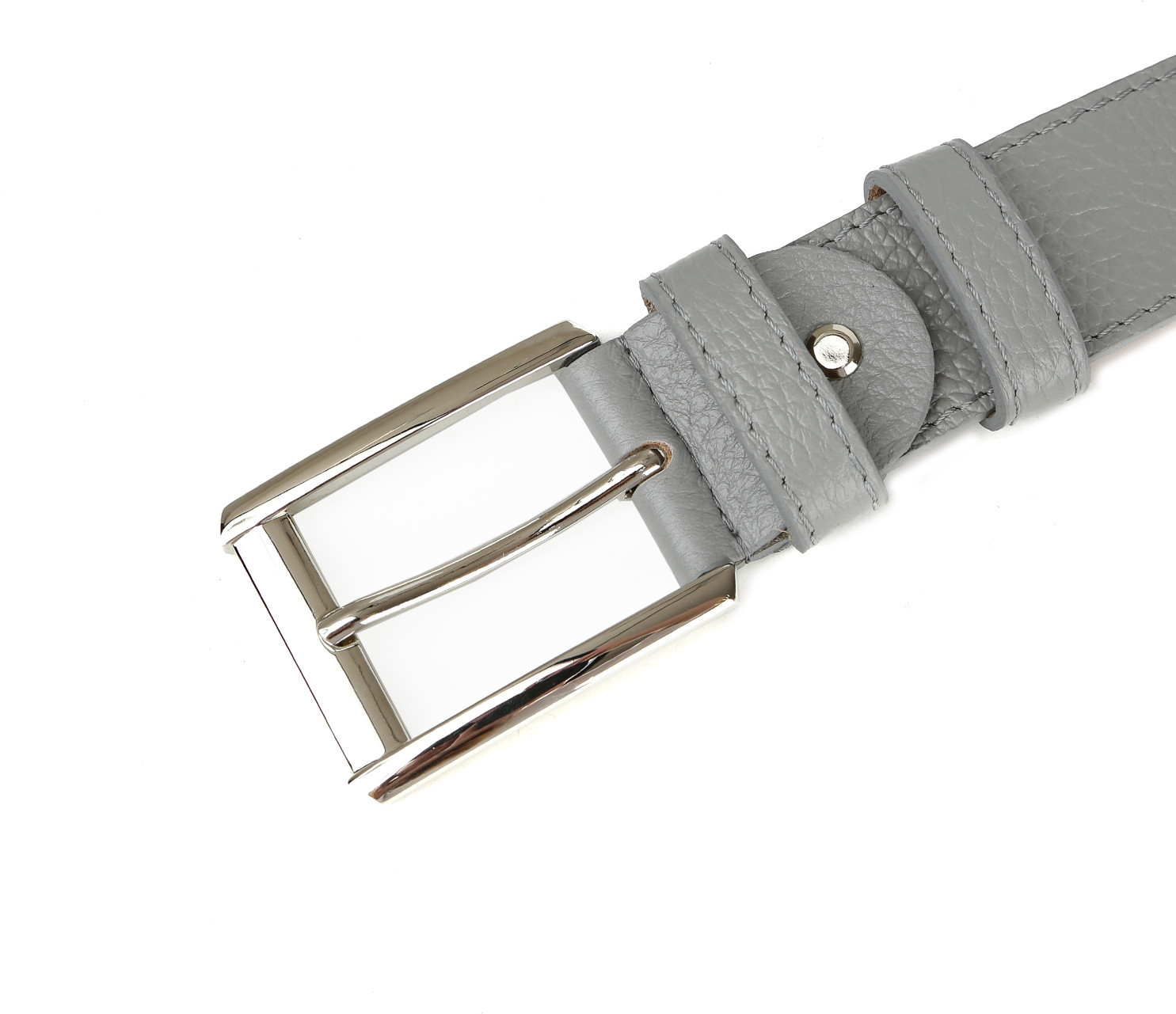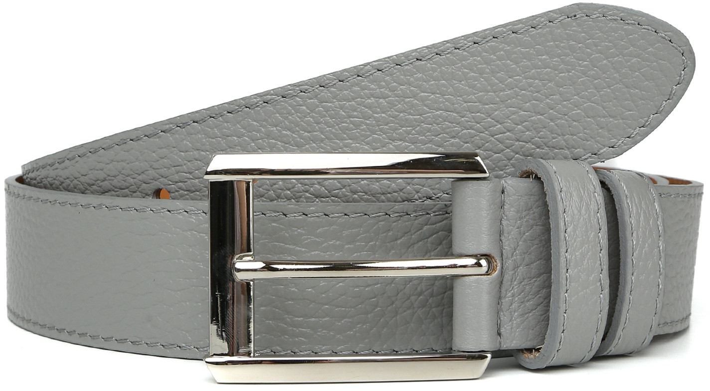 Стильный ремень в сером цвете выполнен из мягкой зернистой кожи и декорирован отстрочками — по одной с каждого края. Тыльная сторона — из гладкого плотного спила. Модель дополнена прямоугольной пряжкой из прочного гальванического сплава с покрытием — серебро. Пряжка крепится к изделию с помощью винта, что позволяет легко отрегулировать длину. Две шлевки из зернистой кожи в тон изделию: одна закреплена, вторая — подвижная.