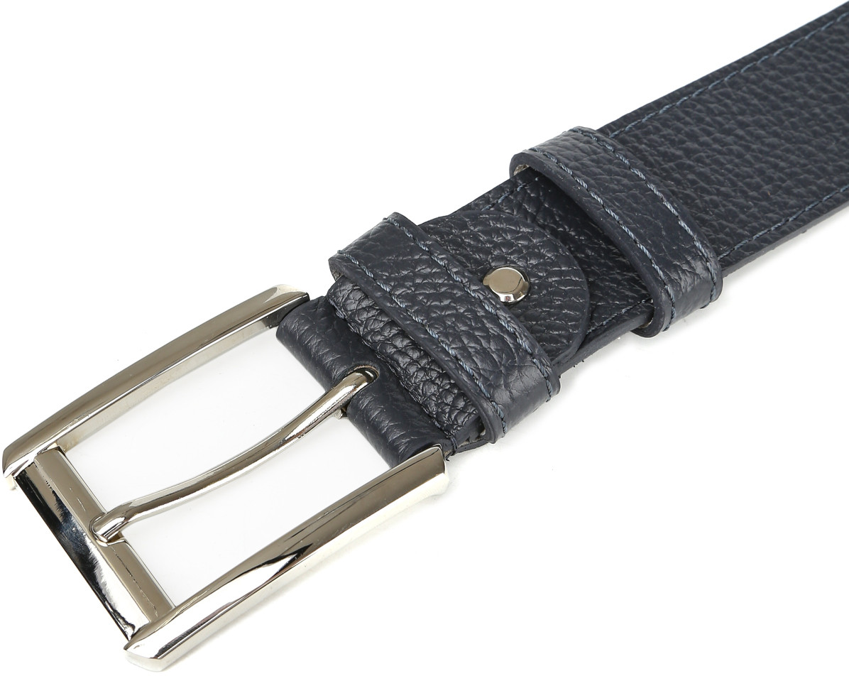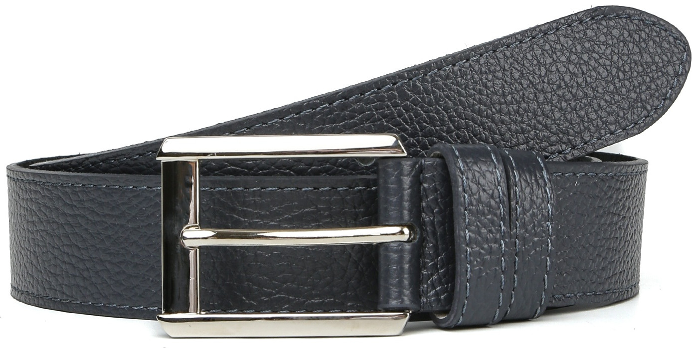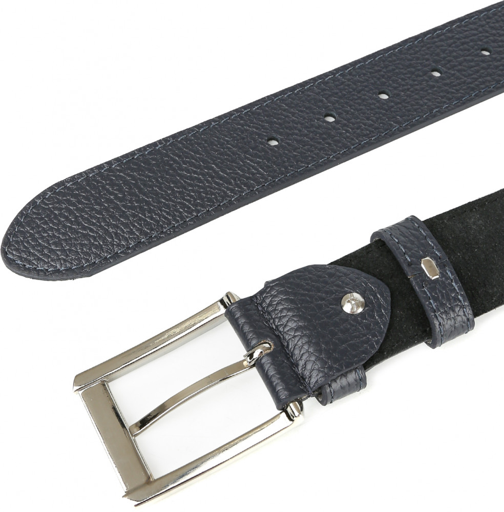 Стильный ремень в темно-синем цвете выполнен из мягкой зернистой кожи и декорирован отстрочками — по одной с каждого края. Тыльная сторона — из гладкого плотного спила. Модель дополнена прямоугольной пряжкой из прочного гальванического сплава с покрытием — серебро. Пряжка крепится к изделию с помощью винта, что позволяет легко отрегулировать длину. Две шлевки из зернистой кожи в тон изделию: одна закреплена, вторая — подвижная.