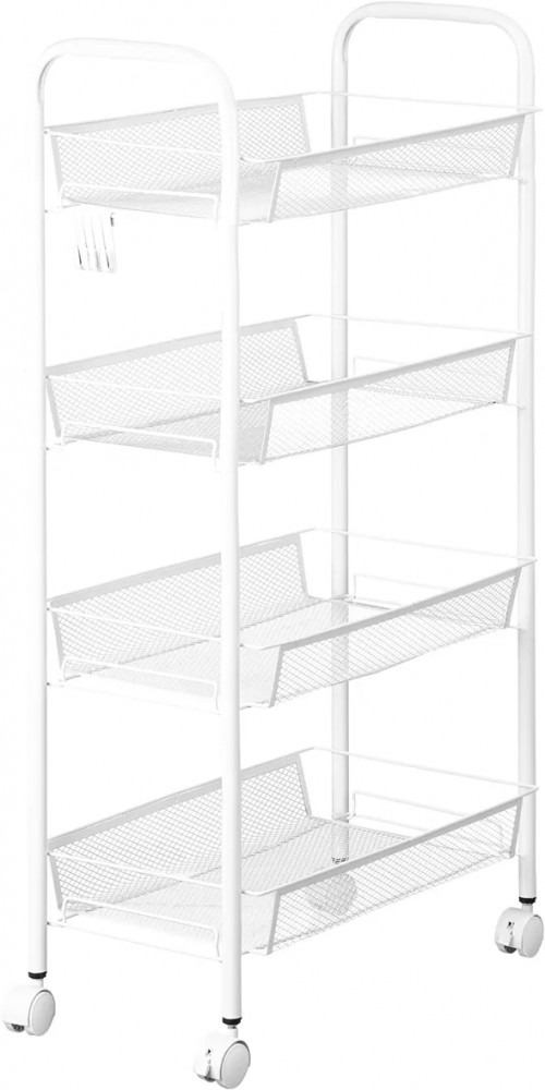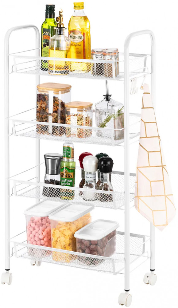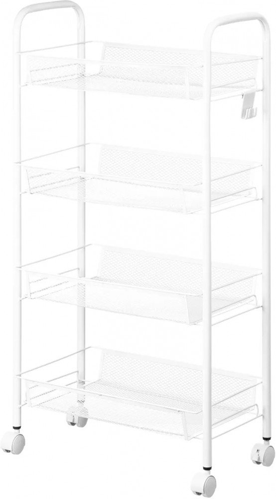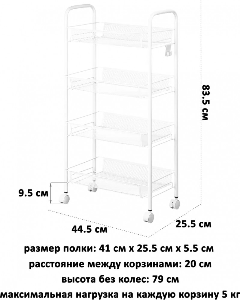 Четырёхъярусная этажерка 44.5×25.5×83.5 см (без колес — 44.5×25.5×79 см) поможет создать порядок. Выполнена из металла, имеет 4 колёсика. Размер 1 полки — 41×25.5×5.5 см, расстояние между корзинками — 20 см. Максимальная нагрузка на 1 полочку — 5 кг. Высота от пола до нижней корзины без колес — 5.5 см, с колесами — 9.5 см. 2 колесика имеют фиксаторы, система тормоза позволяет закрепить этажерку на месте. Маленький открытый шкаф имеет 4 крючка для подвешивания аксессуаров, инструментов и хозяйственного инвентаря. Можно повесить щётки, мочалку, пакет или косметичку. Крючки съёмные, можно убрать.