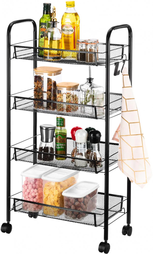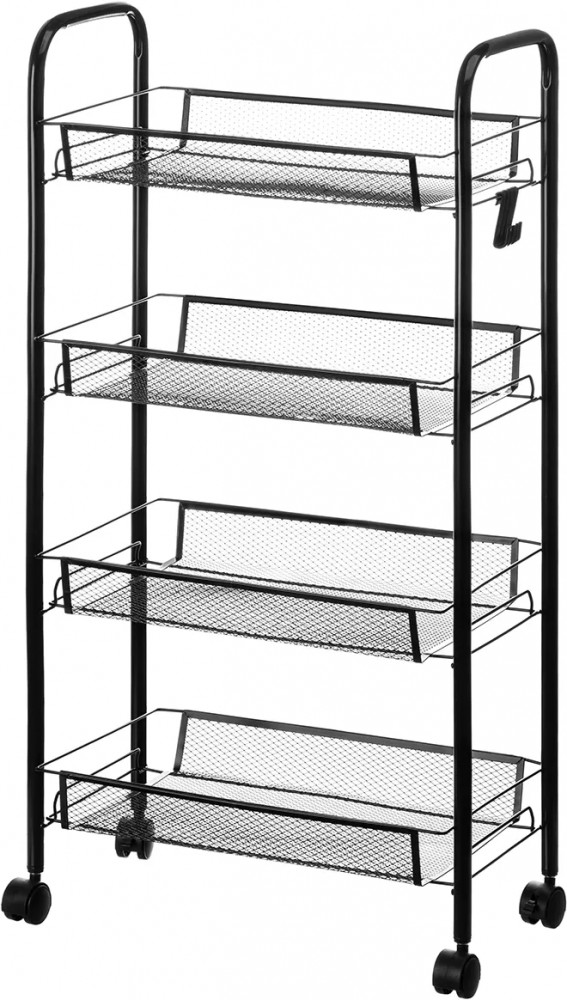 Четырёхъярусная этажерка 44.5×25.5×83.5 см (без колес — 44.5×25.5×79 см) поможет создать порядок. Выполнена из металла, имеет 4 колёсика. Размер 1 полки — 41×25.5×5.5 см, расстояние между корзинками — 20 см. Максимальная нагрузка на 1 полочку — 5 кг. Высота от пола до нижней корзины без колес — 5.5 см, с колесами — 9.5 см. 2 колесика имеют фиксаторы, система тормоза позволяет закрепить этажерку на месте. Маленький открытый шкаф имеет 4 крючка для подвешивания аксессуаров, инструментов и хозяйственного инвентаря. Можно повесить щётки, мочалку, пакет или косметичку. Крючки съёмные, можно убрать.