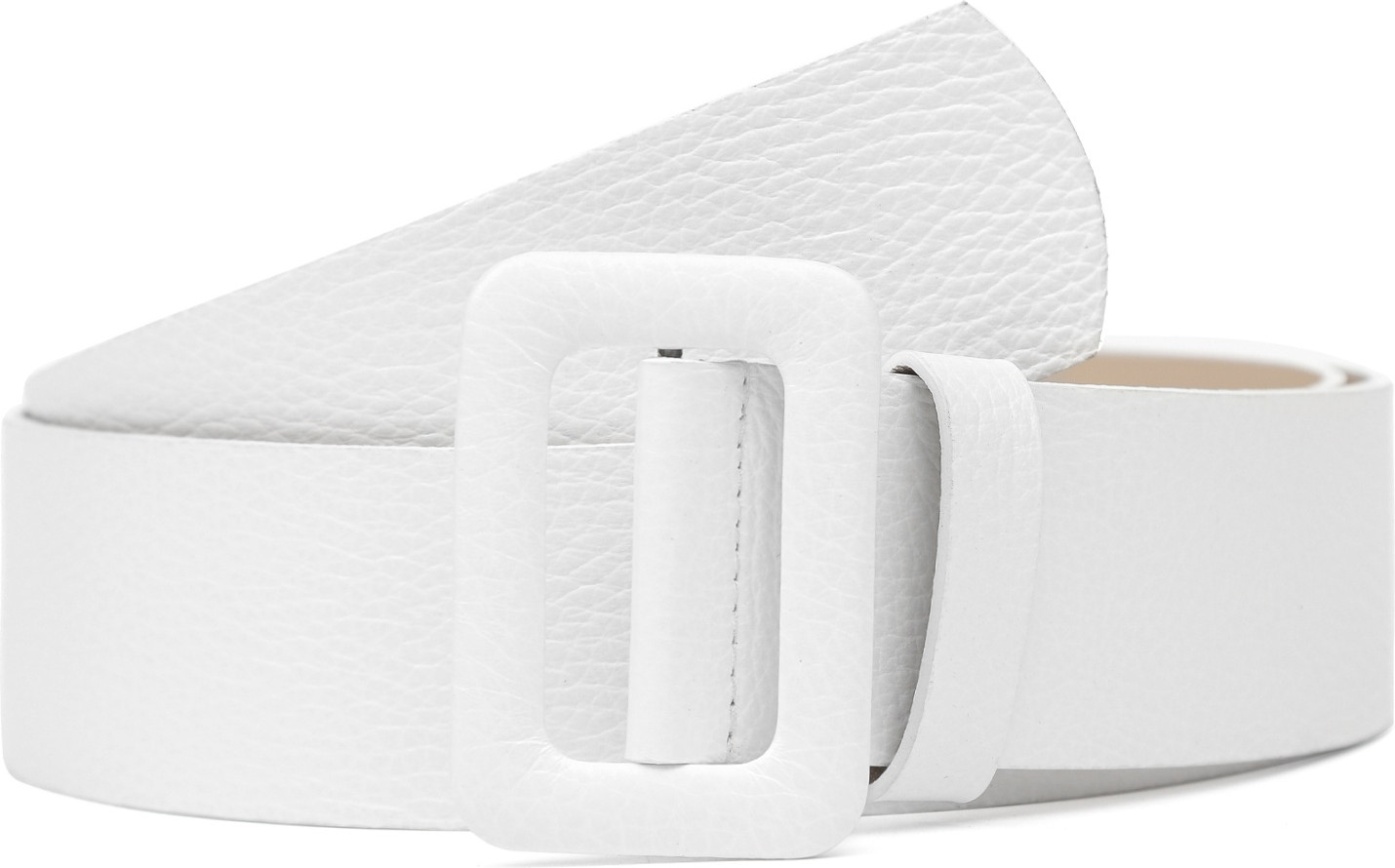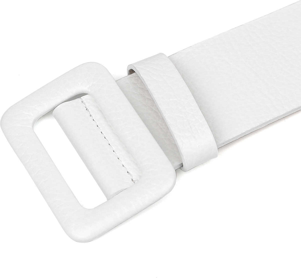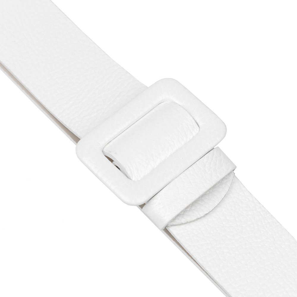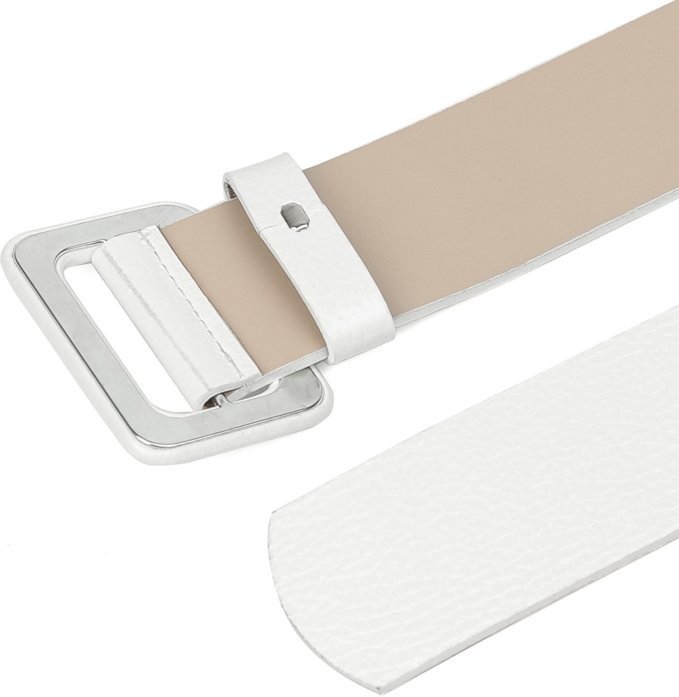 Широкий ремень выполнен из мягкой зернистой кожи. Тыльная сторона — из гладкого плотного спила. Модель дополнена крупной обтяжной пряжкой. Подвижная шлевка из кожи позволяет закрепить свободный край ремня.