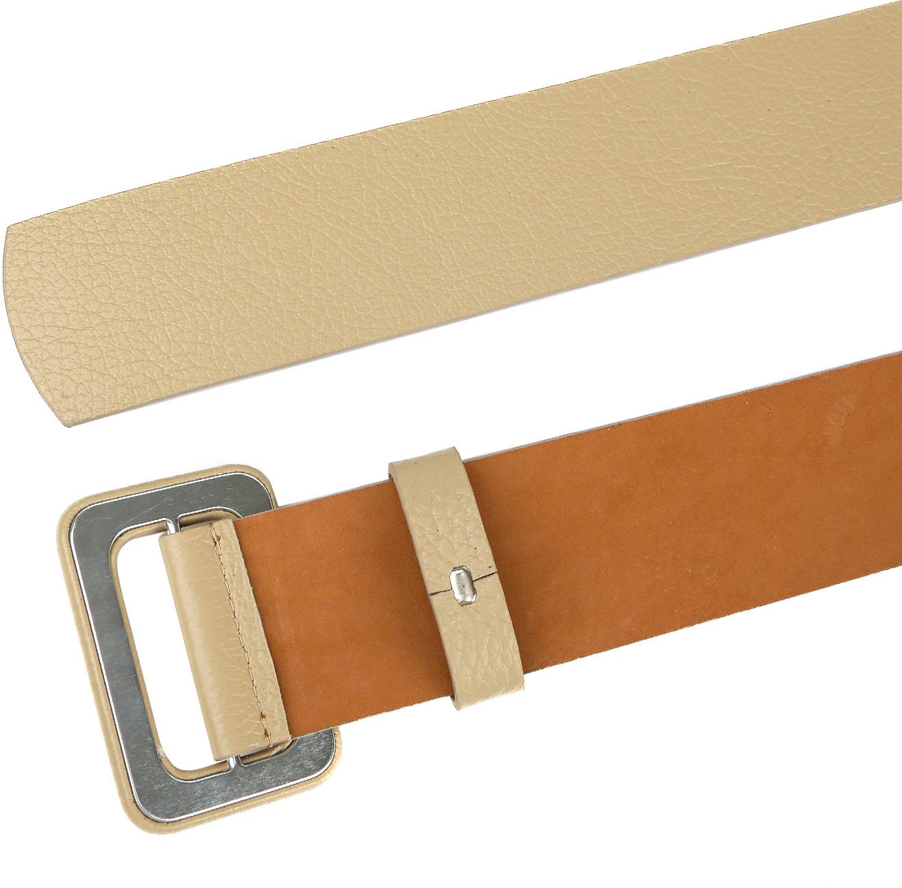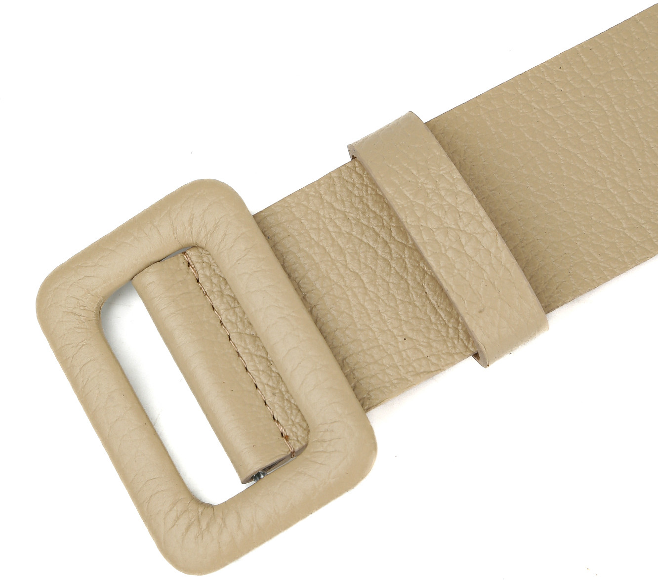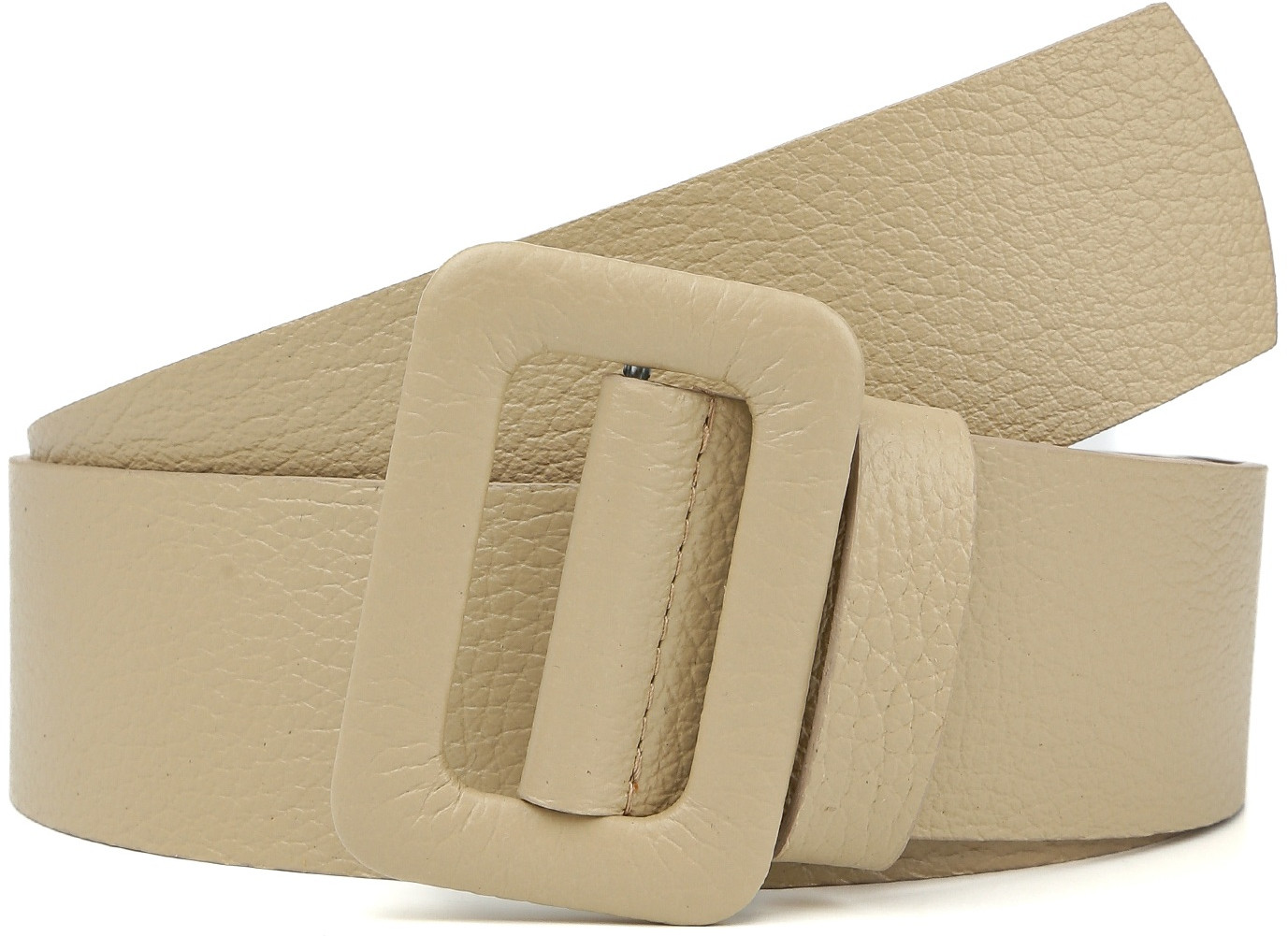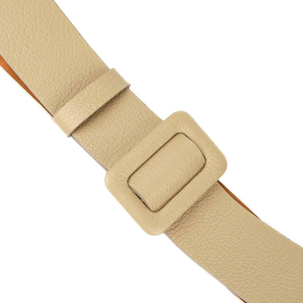 Широкий ремень выполнен из мягкой зернистой кожи. Тыльная сторона — из гладкого плотного спила. Модель дополнена крупной обтяжной пряжкой. Подвижная шлевка из кожи позволяет закрепить свободный край ремня.