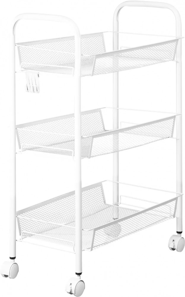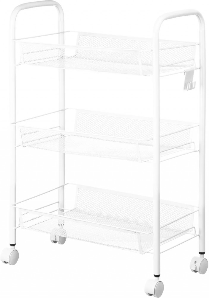 Трёхъярусная этажерка 44.5×25.5×63 см (без колес — 44.5×25.5×58.5 см) поможет создать порядок. Выполнена из металла, имеет 4 колёсика. Размер 1 полки — 41×25.5×5.5 см, расстояние между корзинками — 20 см. Максимальная нагрузка на 1 полочку — 5 кг. Высота от пола до нижней корзины без колес — 5.5 см, с колесами — 9.5 см. 2 колесика имеют фиксаторы, система тормоза позволяет закрепить этажерку на месте. Маленький открытый шкаф имеет 4 крючка для подвешивания аксессуаров, инструментов и хозяйственного инвентаря. Можно повесить щётки, мочалку, пакет или косметичку. Крючки съёмные, можно убрать.