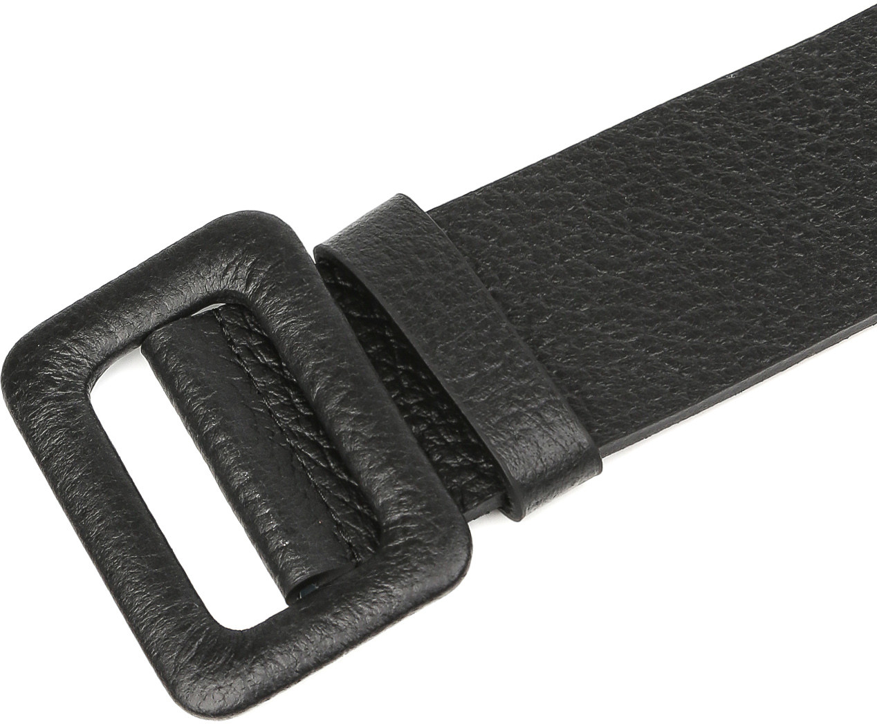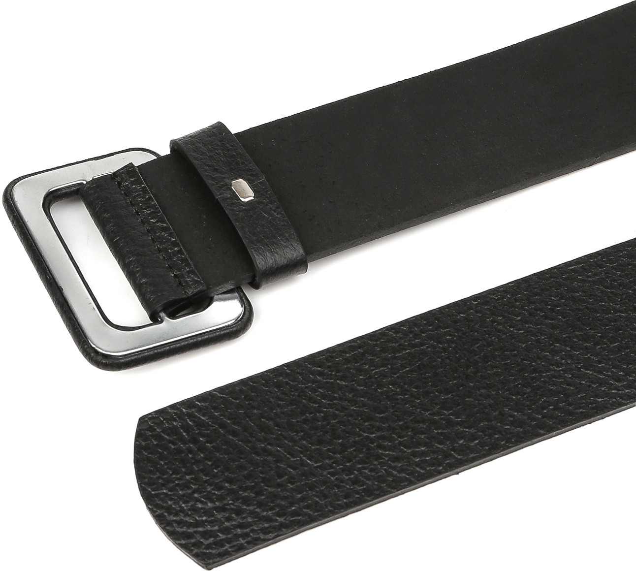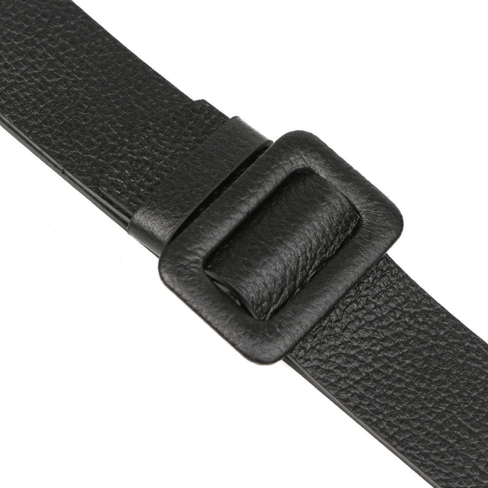 Широкий ремень выполнен из мягкой зернистой кожи. Тыльная сторона — из гладкого плотного спила. Модель дополнена крупной обтяжной пряжкой. Подвижная шлевка из кожи позволяет закрепить свободный край ремня.