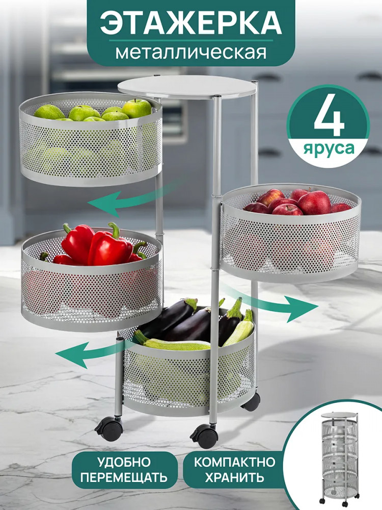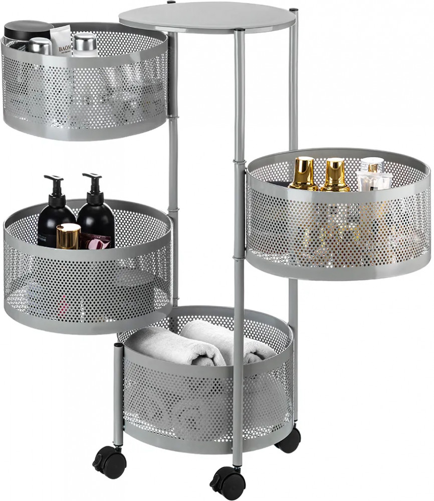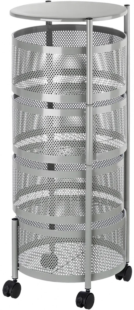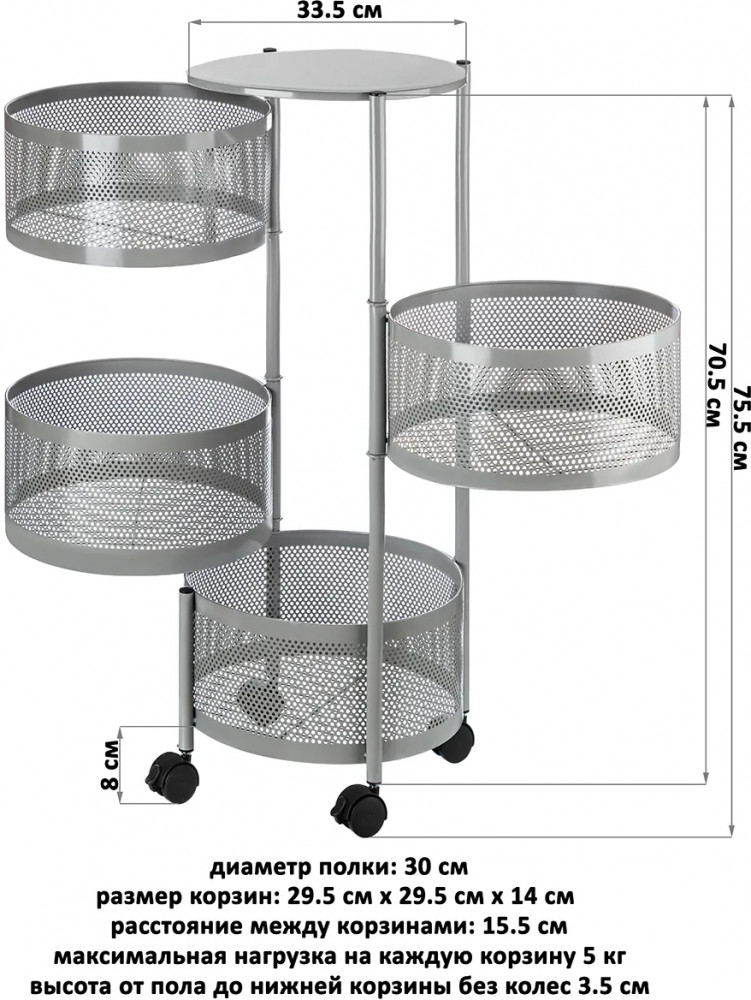 Четырёхъярусная этажерка El Casa размером 33.5×32×75.5 см на 4 колесах поможет создать порядок и организовать систему хранения в вашем доме. Выполнена из металла. Диаметр каждого круглого ящичка — 30 см, размер — 29.5×29.5×14 см, расстояние между ящиками — 15.5 см. Максимальная нагрузка на одну полочку — 5 кг. Высота от пола до нижней корзины без колес 3.5 см, с колесами — 8 см. Отсеки вращаются по кругу и имеют дно в виде металлической сетки. Благодаря колесикам стеллаж с полочками удобно перемещать из одной комнаты в другую. Система тормоза в виде фиксаторов на 2 колесах позволит устойчиво закрепить положение этажерки в нужном месте.