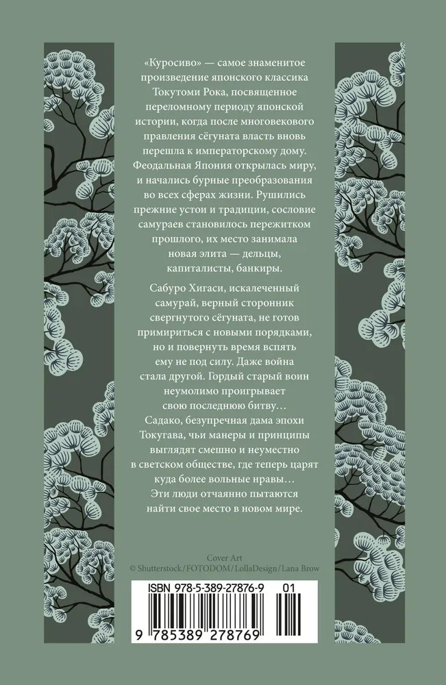 💳 Оплатить за товар можно при получении 🇰🇿 Есть бесплатная доставка по Казахстану 🎁 Копите бонусы с каждой покупки Серия: Изящная классика Востока «Куросиво» — самое знаменитое произведение японского классика Токутоми Рока, посвященное переломному периоду японской истории, когда после многовекового правления сёгуната власть вновь перешла к императорскому дому. Феодальная Япония открылась миру, и начались бурные преобразования во всех сферах жизни. Рушились прежние устои и традиции, сословие самураев становилось пережитком прошлого, их место занимала новая элита — дельцы, капиталисты, банкиры. В романе множество персонажей, которые сменяют друг друга, позволяя взглянуть на события под разными углами и делая картину объемной и полифоничной. Но центральными героями становятся люди ушедшей эпохи. Сабуро Хигаси, пожилой, искалеченный самурай, верный сторонник свергнутого сёгуната, не готов примириться с новыми порядками, но и повернуть время вспять ему не под силу. Даже война стала другой. Гордый старый воин неумолимо проигрывает свою последнюю битву... Садако, безупречная дама эпохи Токугава, чьи манеры и принципы выглядят смешно и неуместно при новых порядках... Эти люди отчаянно пытаются найти свое место в новом мире. |