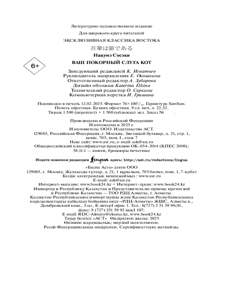 💳 Оплатить за товар можно при получении 🇰🇿 Есть бесплатная доставка по Казахстану от 1 дня 🎁 Копите бонусы с каждой покупки Серия: Эксклюзивная классика Востока (м) Котенком он проник на кухню школьного учителя, который, пожалев кроху, оставил его в своем доме. Теперь он степенный домашний кот, донимающий прислугу, отдающий должное хозяину и лениво играющий с его детьми. Наблюдая за происходящим вокруг, кот рассказывает о том, как смешны и трогательны люди в своих слабостях и заблуждениях. Книга «Ваш покорный слуга кот» — это остроумная пародия на общественные нормы и ценности, ставшая началом творческого пути Нацумэ Сосэки, классика новой японской литературы. В издании представлен неадаптированный текст на языке оригинала, при этом устаревшие и сложные для понимания слова снабжены фуриганой. |