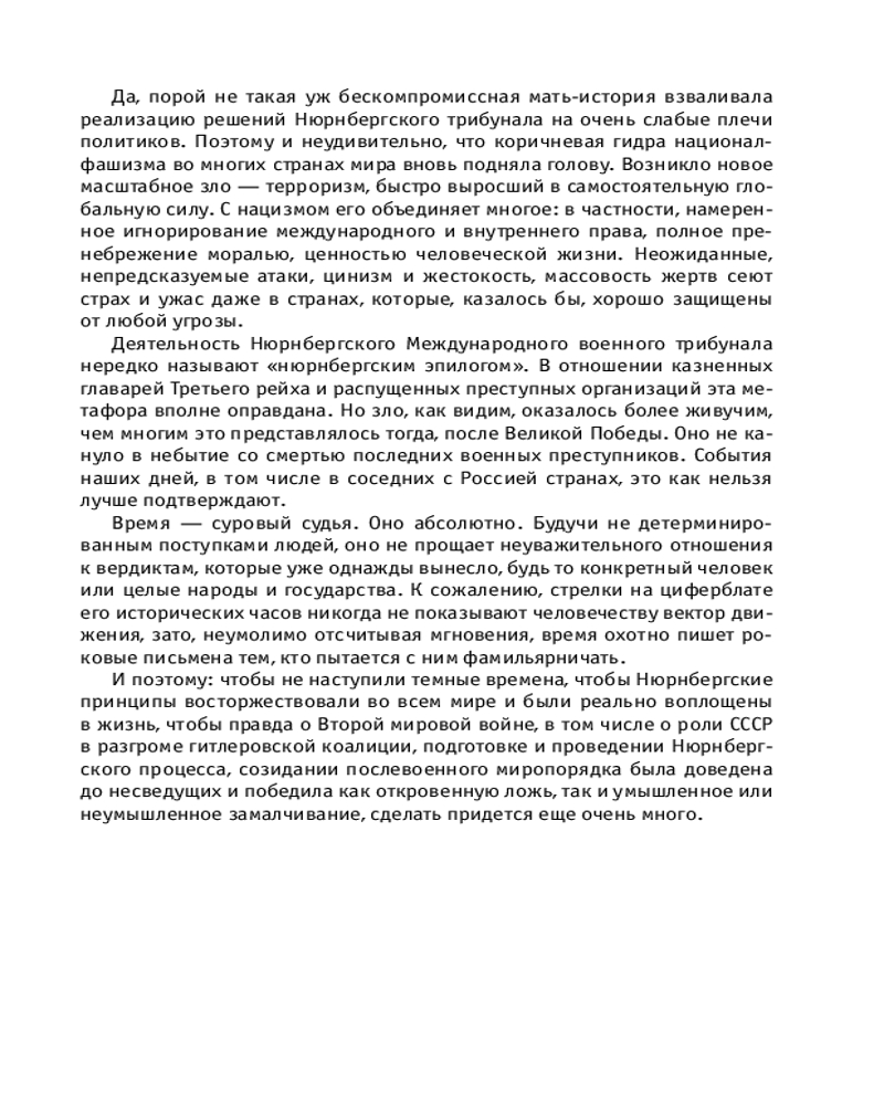 💳 Оплатить за товар можно при получении 🇰🇿 Есть бесплатная доставка по Казахстану от 1 дня 🎁 Копите бонусы с каждой покупки Серия: 80 лет Победы Книга посвящена самому важному судебному процессу в истории человечества — Нюрнбергскому трибуналу. Международный военный трибунал в Нюрнберге стал первым в истории опытом осуждения преступлений государственного масштаба — правящего режима, его карательных институтов, высших политических и военных деятелей, промышленников и финансистов. Издание подготовлено на основе редких архивных документов, в том числе недавно рассекреченных, малодоступных источников, новейших исследований, воспоминаний современников, а также личных встреч автора с непосредственными участниками тех далеких событий и их родственниками. Часть материалов публикуется впервые. |