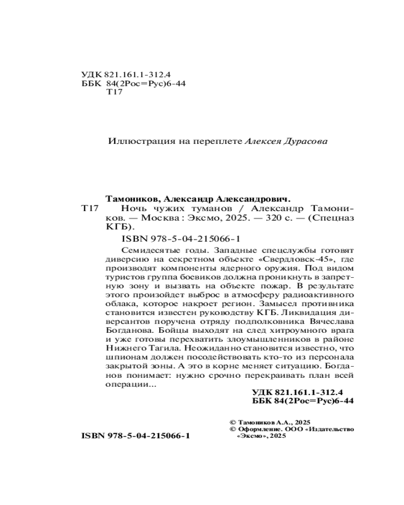 Ночь чужих тумановАлександр Александрович Тамоников В данный момент этот товар отсутствует в продаже. Возможно, у нас найдется аналогичный или похожий товар здесь. Серия: Спецназ КГБ Семидесятые годы. Западные спецслужбы готовят диверсию на секретном объекте «Свердловск-45», где производят компоненты ядерного оружия. Под видом туристов группа боевиков должна проникнуть в запретную зону и вызвать на объекте пожар. В результате этого произойдет выброс в атмосферу радиоактивного облака, которое накроет регион. Замысел противника становится известен руководству КГБ. Ликвидация диверсантов поручена отряду подполковника Вячеслава Богданова. Бойцы выходят на след хитроумного врага и уже готовы перехватить злоумышленников в районе Нижнего Тагила. Неожиданно становится известно, что шпионам должен посодействовать кто-то из персонала закрытой зоны. А это в корне меняет ситуацию. Богданов понимает: нужно срочно перекраивать план всей операции... |