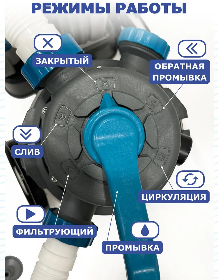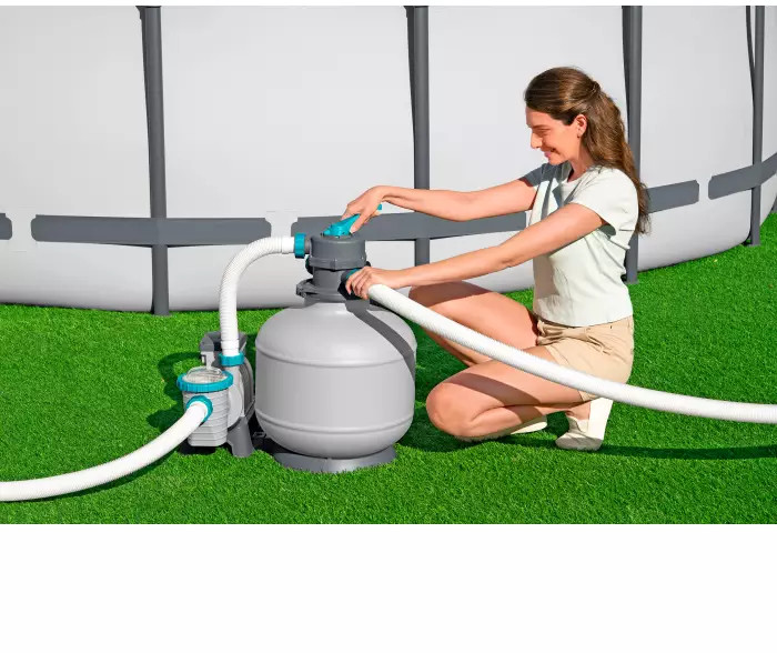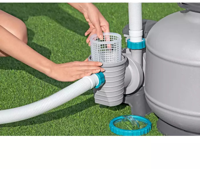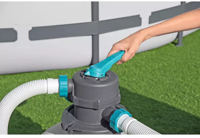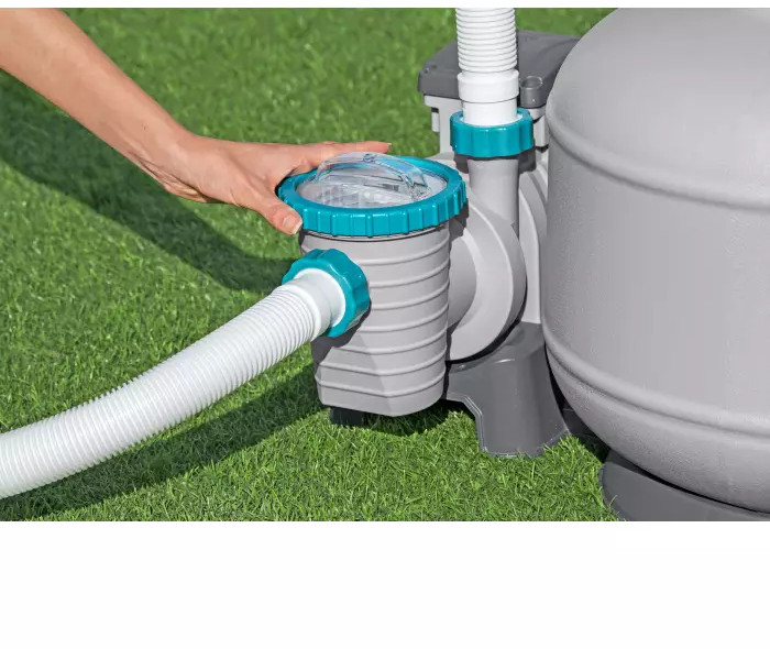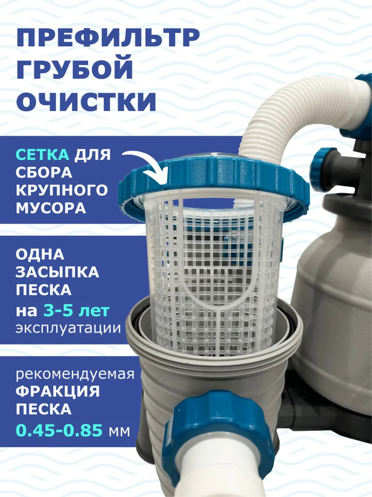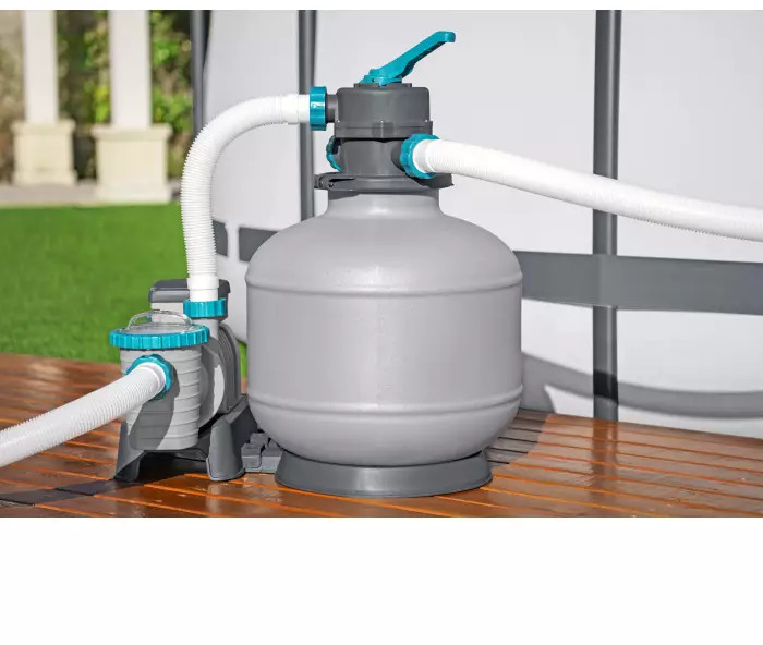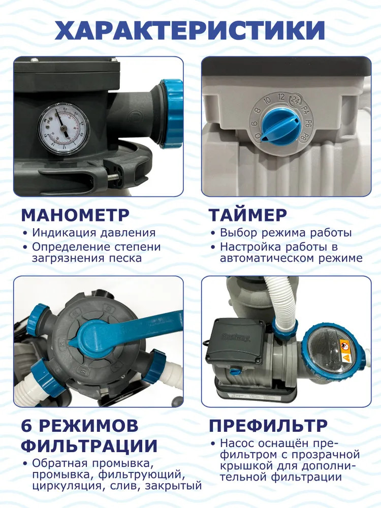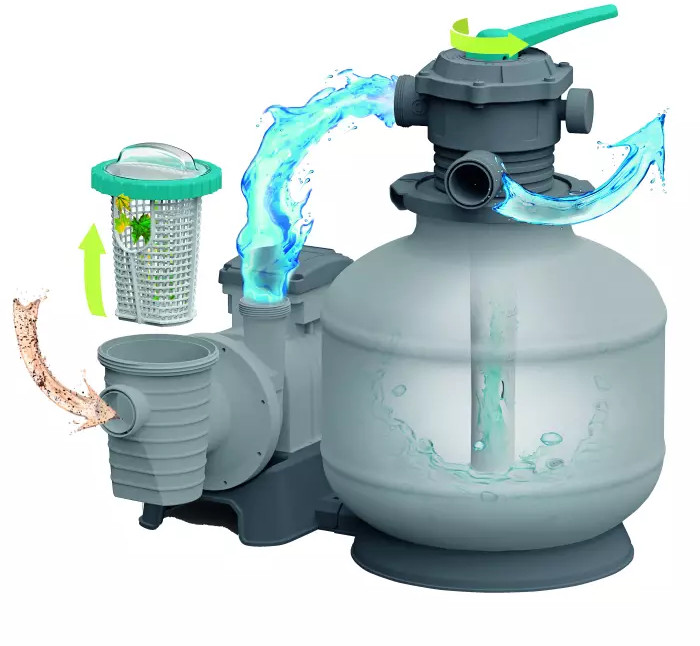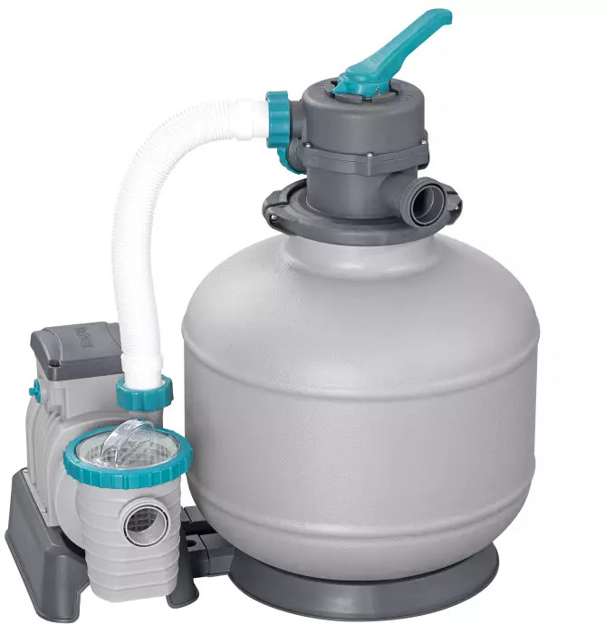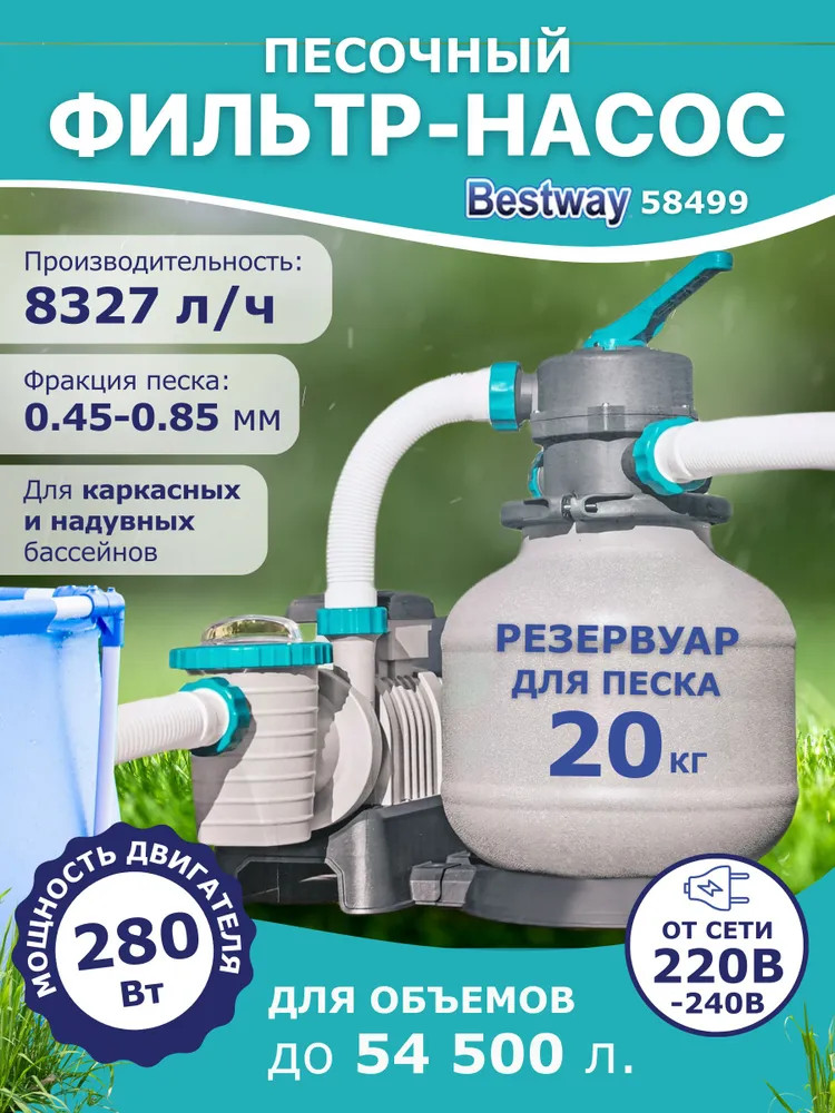 Песочный фильтр Bestway 58499 используется для очистки воды в бассейне. Основным отличием данного фильтра является высокое качество очистки воды, высокая производительность и удобное использование. В качестве фильтрующего элемента используется специально просеянный кварцевый песок 20 кг (0.45-0.85 мм) или специальный наполнитель Bestway Polysphere (шарики) для песочных фильтров 58475. Фильтрующая установка комплектуется таймером, насосом, шестипозиционным клапаном переключения режимов работы, манометром для индикации давления в системе. По сути этот фильтр представляет собой бочонок с песком, через который прогоняют воду. С помощью шестипозиционного крана, которым оборудована фильтровальная установка, возможно промыть песок не вынимая его из емкости.