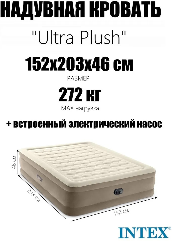 Двуспальная кровать «Ultra Plush» Bed обеспечивает комфортным сном не зависимо от нагрузки. Все дело в специальных независимых перегородках, выполненных из гибкого и эластичного материала. Покрытие кровати соответствует названию — на ощупь ее не отличить от качественной ткани. Однако это — лишь обработанный особым способ винил. ПВХ призван вместе с комфортом дарить надежность своим пользователям. За несколько минут можно разложить полноценное спальное место, а когда оно не потребуется — сложить кровать в специальную сумку. Это возможно благодаря встроенному электрическому насосу, надувающему кровать лишь за несколько минут. Надувная кровать может без проблем заменить полноценное спальное место, ведь ее разрабатывали ради этой задачи.