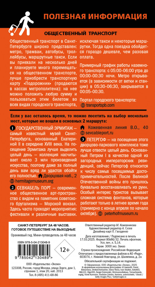Санкт-Петербург за 48 часов. Готовое путешествие на выходныеВ данный момент этот товар отсутствует в продаже. Возможно, у нас найдется аналогичный или похожий товар здесь. Серия: Оранжевый гид. Мини-путеводитель за 48 часов Санкт-Петербург — город роскошных дворцов и извилистых каналов, вдохновивший множество поэтов и писателей. Это город с особенной атмосферой, и, хоть с момента его основания прошло еще не так много лет, здесь на каждом шагу происходили знаковые для страны события. Мини-путеводитель «Санкт-Петербург за 48 часов» — идеальное решение для тех, кто ограничен по времени, но кто хочет посмотреть в Северной Венеции как можно больше. В нем собраны самые знаковые достопримечательности, которые стоит увидеть, а также лучшие рестораны и кафе, где можно вкусно поесть. Мы детально продумали каждый шаг за вас, чтобы вы могли максимально насладиться Петербургом! Просто следуйте рекомендациям, наслаждайтесь атмосферой города и открывайте для себя Санкт-Петербург! |
