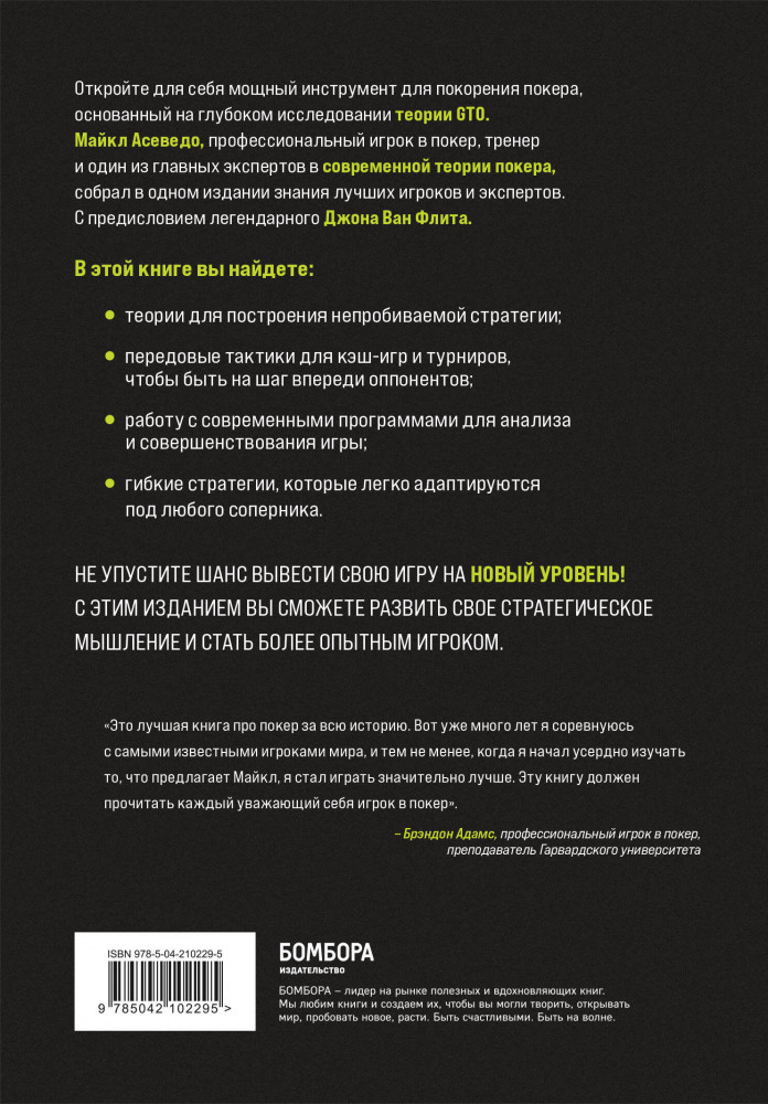 💳 Оплатить за товар можно при получении 🇰🇿 Есть бесплатная доставка по Казахстану от 1 дня 🎁 Копите бонусы с каждой покупки Серия: Покер. Лучшие книги Откройте для себя мощный инструмент для покорения покера, основанный на глубоком исследовании теории GTO. Майкл Асеведо, профессиональный игрок в покер, тренер и один из главных экспертов в современной теории покера, собрал в одном издании знания лучших игроков и экспертов. С предисловием легендарного Джона Ван Флита. |