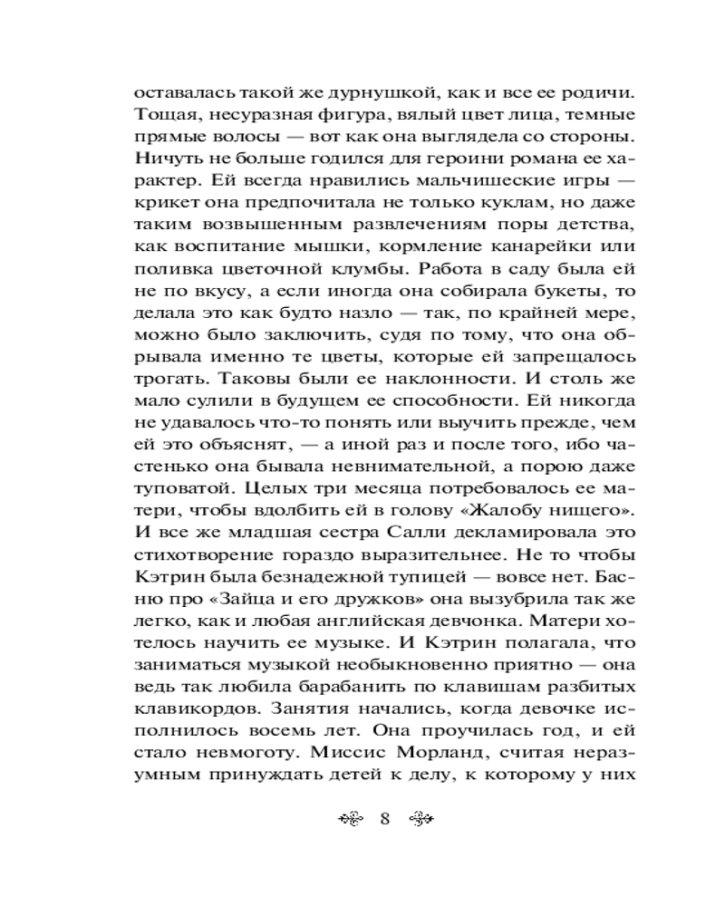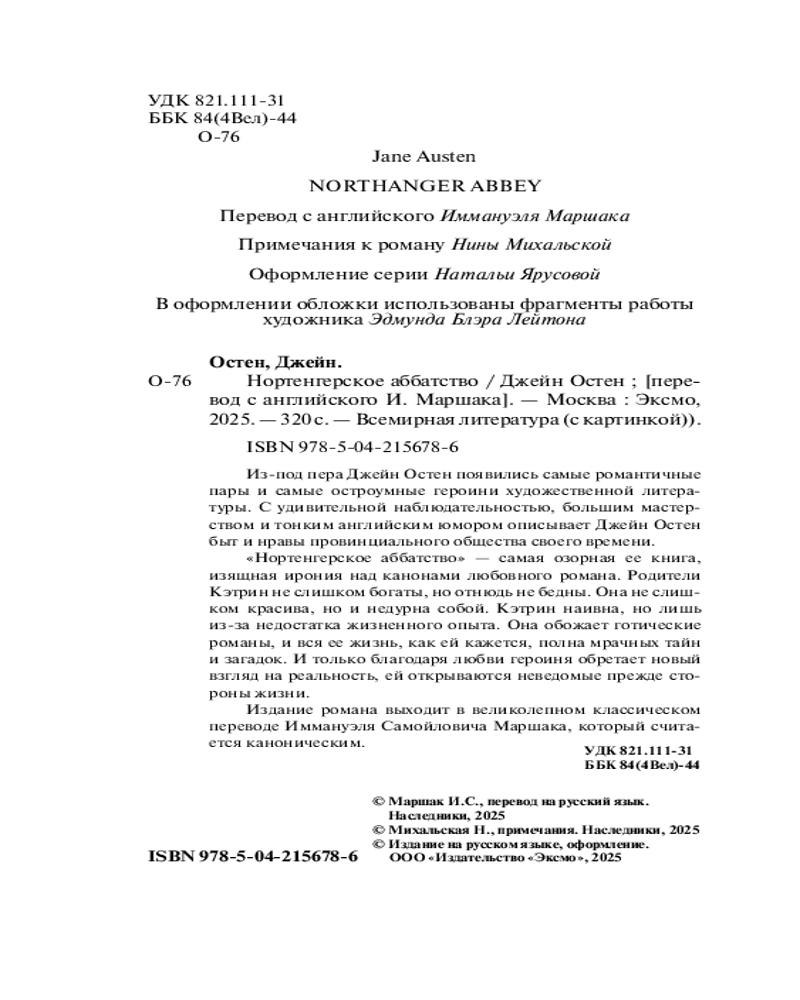 💳 Оплатить за товар можно при получении 🇰🇿 Есть бесплатная доставка по Казахстану от 1 дня 🎁 Копите бонусы с каждой покупки Серия: Всемирная литература (новое оформление) Из-под пера Джейн Остен появились самые романтичные пары и самые остроумные героини художественной литературы. С удивительной наблюдательностью, большим мастерством и тонким английским юмором описывает Джейн Остен быт и нравы провинциального общества своего времени. «Нортенгерское аббатство» — самая озорная ее книга, изящная ирония над канонами любовного романа. Родители Кэтрин не слишком богаты, но отнюдь не бедны. Она не слишком красива, но и не дурна собой. Кэтрин наивна, но лишь из-за недостатка жизненного опыта. Она обожает готические романы, и вся ее жизнь, как ей кажется, полна мрачных тайн и загадок. И только благодаря любви героиня обретает новый взгляд на реальность, ей открываются неведомые прежде стороны жизни. Издание романа выходит в великолепном классическом переводе Иммануэля Самойловича Маршака, который считается каноническим. В издание включены примечания Нины Михальской. |