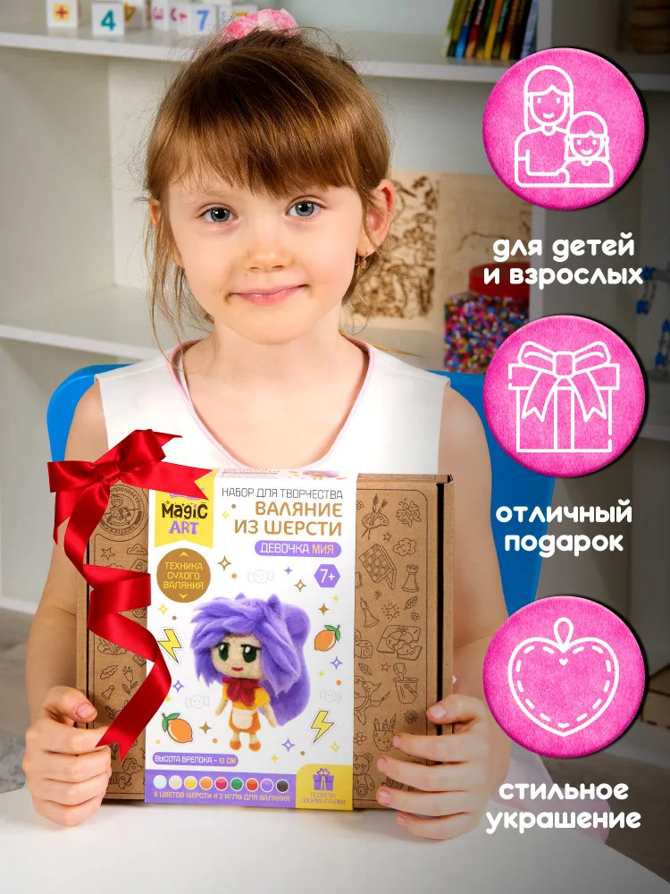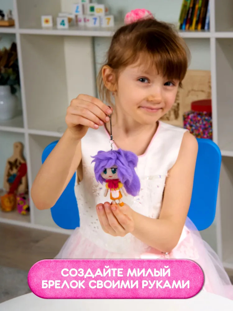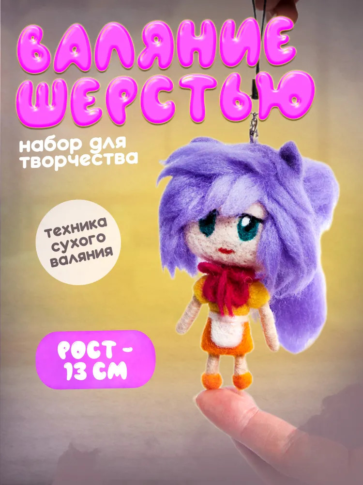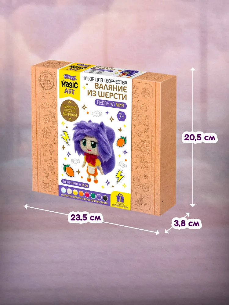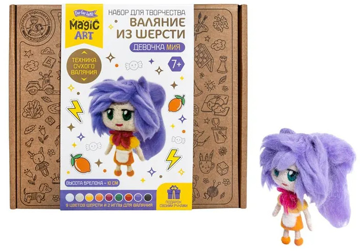 Валяние — особая техника рукоделия , в процессе которой из шерсти для валяния можно создать объёмные игрушки, декоративные элементы или аксессуары. Для валяния используется только натуральная шерсть. Набор для валяния «Девочка Мия» включает все необходимое для создания игрушки или брелока из шерсти. Высота готовой игрушки около 12-13 см.