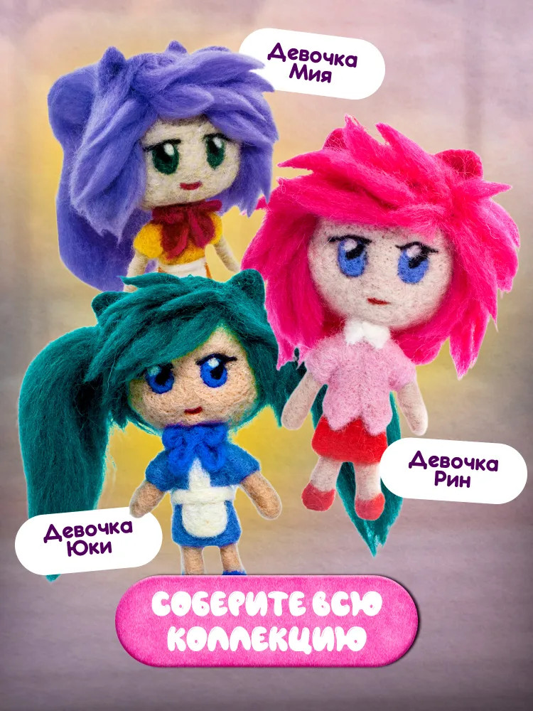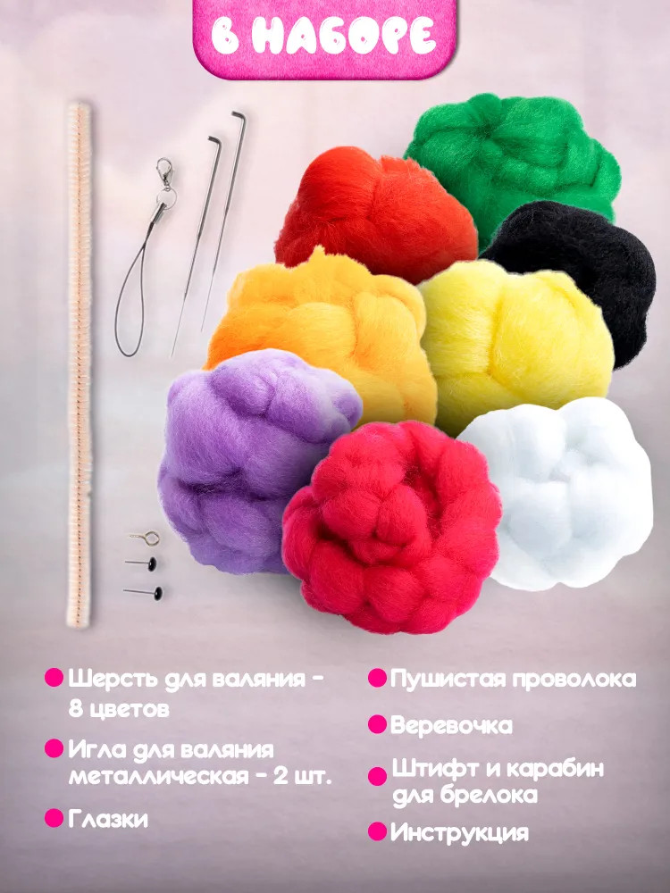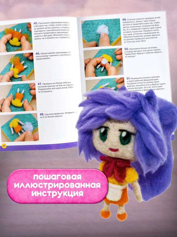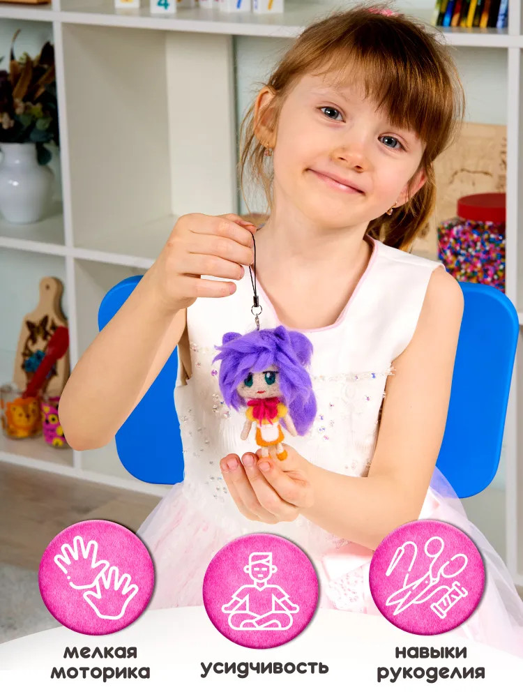 Валяние — особая техника рукоделия , в процессе которой из шерсти для валяния можно создать объёмные игрушки, декоративные элементы или аксессуары. Для валяния используется только натуральная шерсть. Набор для валяния «Девочка Мия» включает все необходимое для создания игрушки или брелока из шерсти. Высота готовой игрушки около 12-13 см.