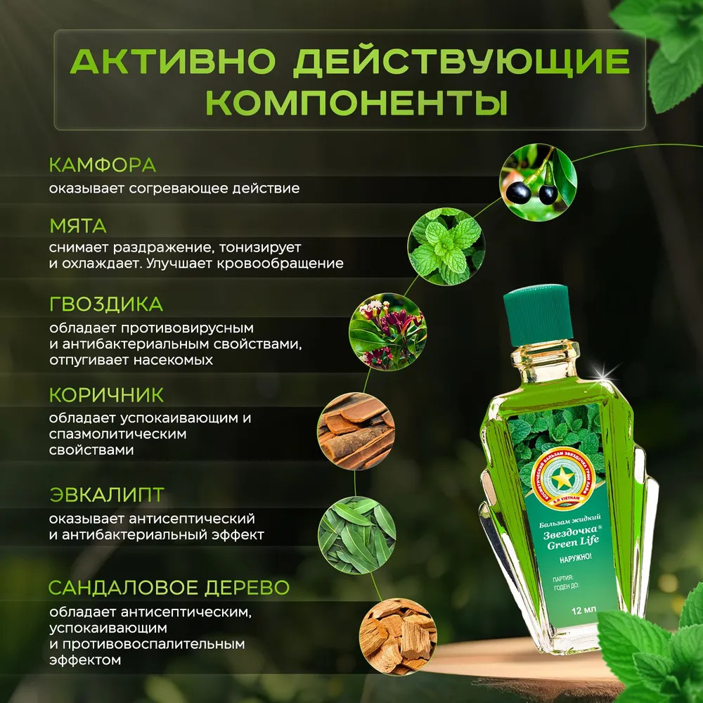 Бальзам «Звездочка Green Life»В данный момент этот товар отсутствует в продаже. Возможно, у нас найдется аналогичный или похожий товар здесь. Сочетание природных эфирных масел является основой чудодейственных свойств жидкого бальзама «Звездочка Green Life». Специальный метод изготовления бальзама по древнему вьетнамскому рецепту способствует легкому проникновению активных веществ в кожу. Эфирные масла, входящие в состав, воздействуют не только на физическое, но и на психологическое самочувствие человека, расширяют сосуды, обеспечивая согревающий эффект. Аромат бальзама позволяет справиться с эмоциональным истощением, побороть последствия усталости и напряжения. Жидкий бальзам «Звездочка Green Life» устраняет неприятные ощущения в носу, успокаивает головную боль, способствует снятию головокружения, быстро снимает усталость, апатию, сонливость, повышает продуктивность. Аромат «Звездочки Green Life» эффективно устраняет неприятные запахи, помогает избавиться от насекомых. |